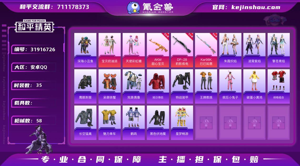 无二次-安卓 手Q-2粉装-5特效枪-0载具-0粉色飞行器-17117热力值-3王牌印记-35套装-58枪皮HZ26227013 【热门品类】:套装-深海小丑鱼 【粉色套装】:粉装-宝贝奶油派,粉装-天使彩虹糖 【粉色枪皮等级】:AKM-甜心宝贝(五级),ACE32-萌骑漫游(二级),Kar98K-巳巳如意(四级),Mk14-福马献瑞(五级),DP-28-豹影疾电(四级) 【粉色枪皮】:AKM-甜心宝贝,ACE32-萌骑漫游,Kar98K-巳巳如意,Mk14-福马献瑞,DP-28-豹影疾电 【粉色降落伞】:绝对恒星降落伞,甜心宝贝降落伞,圣堂之誓降落伞,无垠阁降落伞,喜羊羊与灰太狼降落伞,异瞳寒姬降落伞 【稀有套装】:套装-雪国风尚,套装-马上有钱,套装-朱霞炽焰,套装-凌霄紫焰,套装-擎苍青焰 【稀有枪皮】:AKM-春暖花开,AKM-缤纷海域,AKM-灵猫魔法师,M16A4-幻世战舞者,SCAR-L-炫彩节奏,M416-红色方程式,AUG-耀粉歌者,M762-甜心宝贝,AC-VAL-天降萌叽,ARX-凌霄紫焰,UZI-天降萌叽,UMP45-春暖花开,UMP45-极意拳锋,汤姆逊-天降萌叽,JS9-凌霄紫焰,AWM-圣堂之誓,SKS-炫彩节奏,Mini14-春暖花开,Mini14-炫彩节奏,Mini14-穿刺龙虾,S1897-春暖花开,S12K-极意拳锋,DP-28-彩虹符号,DP-28-甜心宝贝,MG3-幻世战舞者,MG-36-凌霄紫焰,P92-凌霄紫焰,突击盾牌-虎痴许褚,突击盾牌-绝对恒星,平底锅-凌霄紫焰 【其他套装】:套装-完美偶像,套装-旭日情侣,套装-特战装甲,套装-王牌教练,套装-疯狂小兔子,套装-破蛋小黄鸡,套装-绯格组合,套装-长空猛禽,套装-魅力单车,套装-鹤鸣,套装-黑色伏地魔,套装-鹰眼刺客,套装-深海小丑鱼,套装-呆萌铁蟹,套装-星梦畅游 【稀有头盔】:梦幻火箭头盔(1级),甜心宝贝头盔(3级),甜心宝贝头盔(2级),甜心宝贝头盔(1级),幻影战神头盔(2级) 【稀有背包】:甜心宝贝背包(3级),甜心宝贝背包(2级),甜心宝贝背包(1级),...