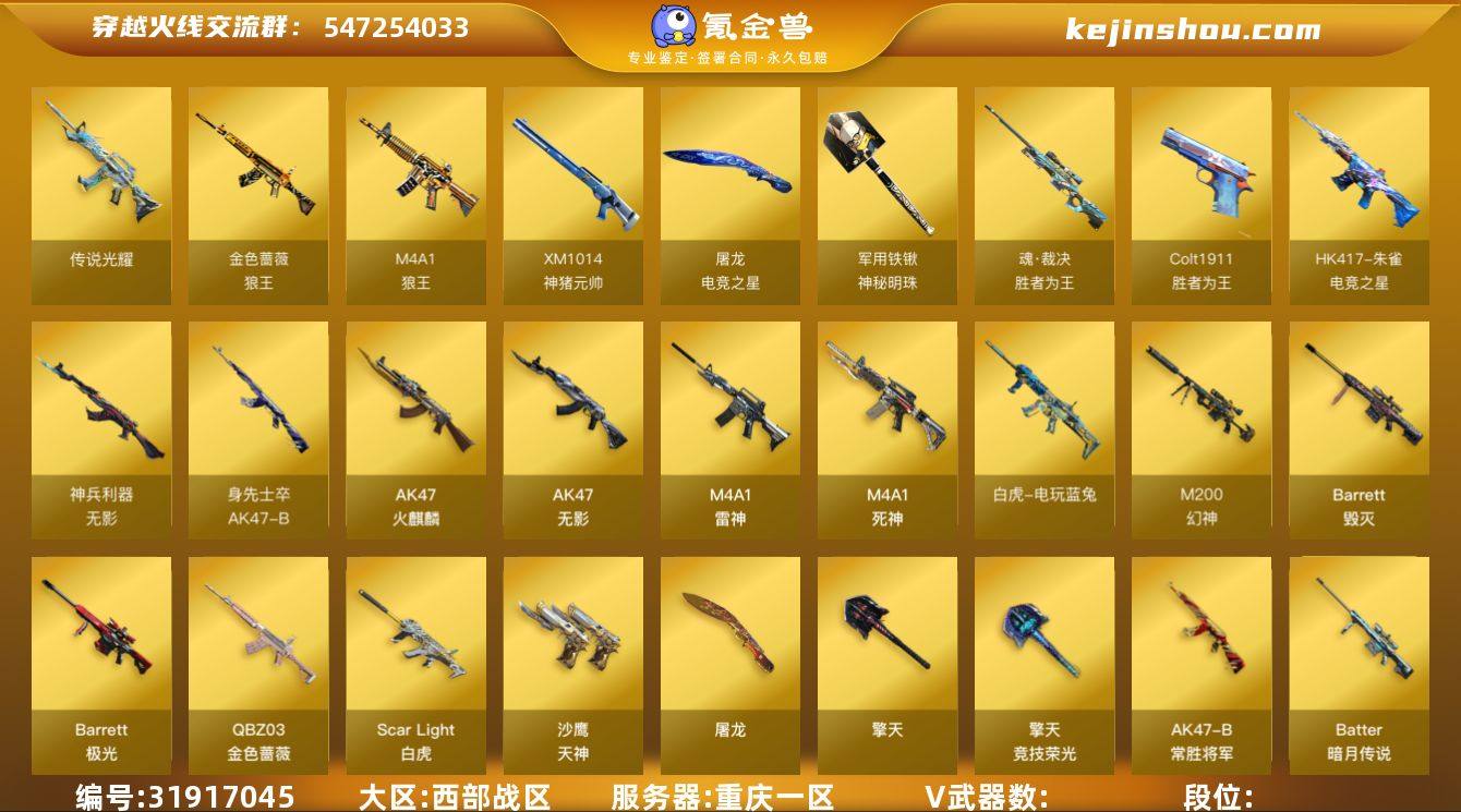 SYWY075★ 重庆一区 ★★ 可二次实名 ★★ 可排位 ★★ 会员等级VIP6 ★★ CF点95 ★★ V武器数39 ★★ 传说光耀 列号5457★★ M200-幻神 ★★ 裁决-胜者为王 皮肤 ★★ Scar Light-白虎 ★★ 白虎-电玩蓝兔 ★M4A1-凌龙-I★ QBZ03-金色蔷薇 ★QBZ03-独角-V★ 零 ★★ 乔伊教练 ★★ 修道士 ★★ M4A1-雷神 ★★ M4A1-战神赵云 ★★ 雷神-CFS十周年纪念版 皮肤 ★★ AK47-火麒麟 ★★ AK47-火麒麟音效卡 ★★ Barrett-毁灭 ★★ 毁灭-战神张飞 ★★ 毁灭-虹光风暴 皮肤 ★