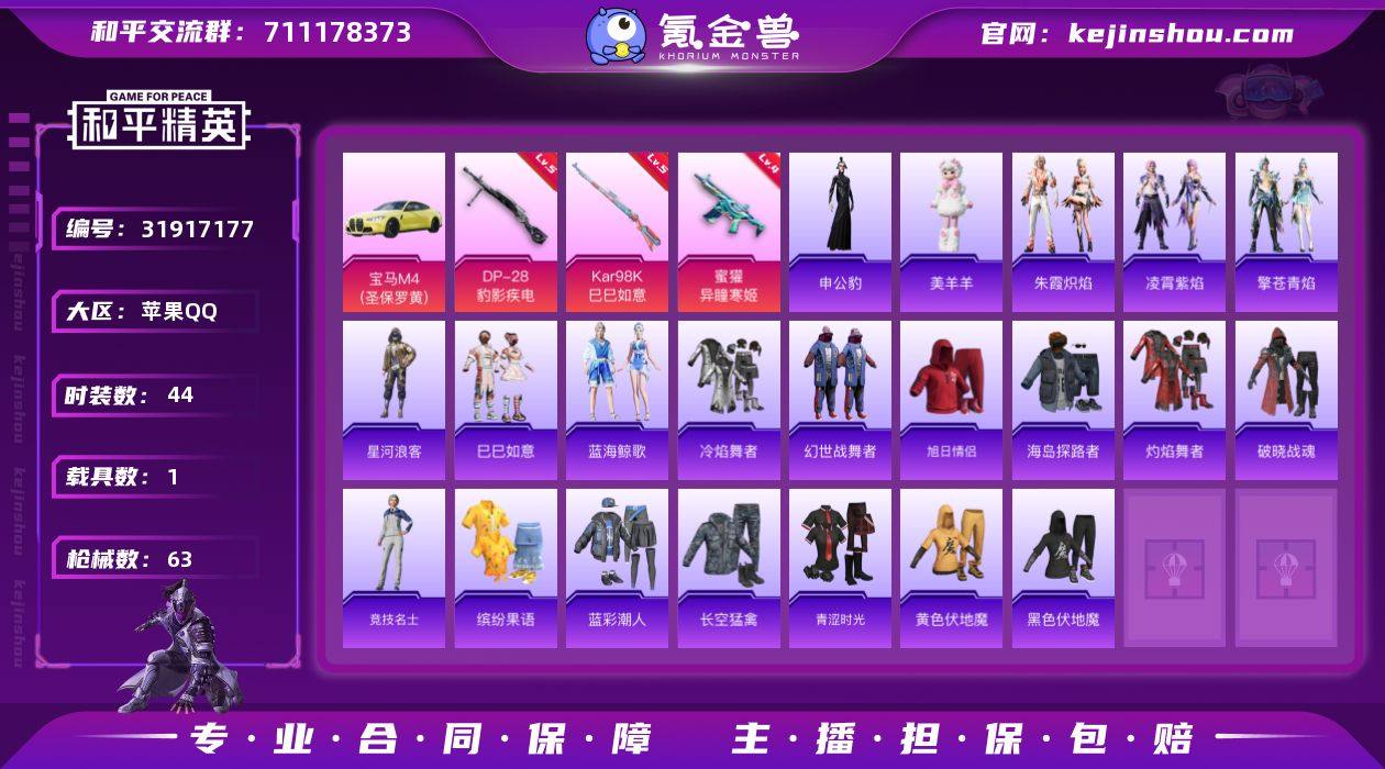 苹果手Q S2-CWM165【4特效枪1载具1粉色飞行器 星河浪客/美羊羊/申公豹】16891热力值-5王牌印记-44套装-63枪皮 【热门品类】:套装-星河浪客 【粉色枪皮等级】:蜜獾-异瞳寒姬(四级),Kar98K-巳巳如意(五级),Mk14-福马献瑞(一级),DP-28-豹影疾电(五级) 【粉色载具】:宝马M4(圣保罗黄) 【粉色枪皮】:蜜獾-异瞳寒姬,Kar98K-巳巳如意,Mk14-福马献瑞,DP-28-豹影疾电 【粉色飞行器】:炫彩糖果飞行器 【粉色降落伞】:荧海星豚降落伞,炫彩糖果降落伞 【