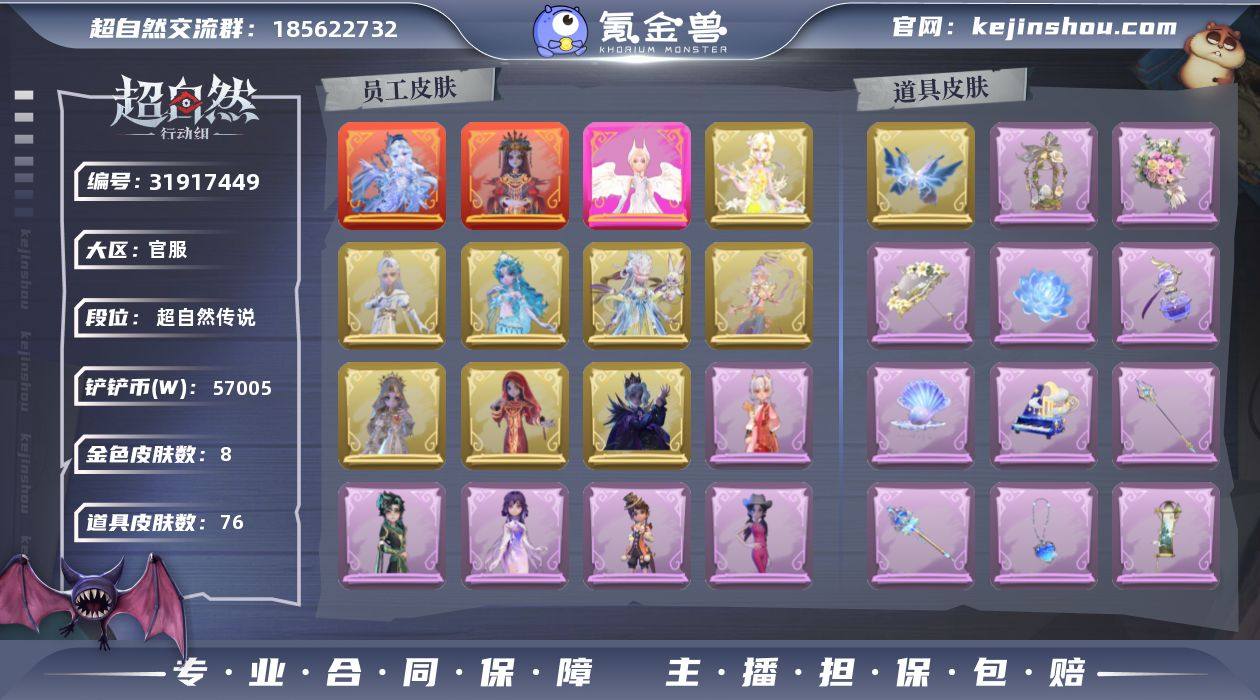 【段位】 超自然传说 【幻梦皮肤数量】1 【金色皮肤数量】4 【紫色皮肤数量】14 【道具皮肤数量】33 【铲铲币】2360 【累充】36400金砖 【赛季魔盒】 普通魔盒 【员工】 小黄,爱丽丝,零,阿念,逍遥,薇薇安,巫铃儿,莉莉,艾伦,爱德华 【幻梦皮肤】 巫铃儿-镜生遗梦 【金色皮肤】 薇薇安-圣光之谕,爱丽丝-血色中的玛丽,小黄-遗失的童话,巫铃儿-镜花辞 【紫色皮肤】 零-赤炼将军,薇薇安-黑月挽歌,小黄-青丘一梦,阿念-王子与骑士,莉莉-情公主,艾伦-水王子,爱丽丝-冰公主,小黄-罗丽,薇薇安-白光莹,阿念-灵昭鹿鸣,小黄-霓裳踏雪,零-青云逸歌,爱丽丝-丝缕哀歌,小黄-呱呱雨衣 【道具皮肤】 铲子-圣心之泪,急救包-蔷薇物语,音响-鸣沙鼓,桃木剑-永眠曲,桃木剑-最后的独角兽,腰包-宝剑八,长鞭-小狗蛇点点鞭,铲子-龙鳞,短管猎枪-星光的裁决,刺刀-赤色之刃,夜视仪-金丝眼镜,摸金符-花落精绝,黄牛能量饮料-青玉抱丹,转轮手枪-新星时代,葫芦-伏妖塔,刺刀-青瓷,桃木剑-凤鸣九天,摸金符-祝祷词,传送按钮-昆仑镜,传送按钮-幻宠之门,专业手电-云端梦想计划,腰包-绯红柴郡猫,额外的背包-飞花令,铲子-焰骨,音响-happy猫,刺刀-小鲨匕首,背饰-兔先生的时钟,背饰-云梦之星,背饰-天使的呼唤,背饰-蝶恋花,背饰-毛球夹子,背饰-在逃小新娘,背饰-鼠鼠小跟班 【头饰】 鱼头怪头套,烈焰红唇头套,大葱明头套,火爆了头套,面具马头套,哈士奇头套,萨卡班甲鱼头套,嘻嘻头套,滑稽头套,呆滞头套,卑微头套,龙傲天头套,驼半仙头套,小狗蛇点点头套,咬咬鲨头套,炙热烧烤,粽小宝头套,像素朋克墨镜,伤心蛙头套,哞哞牛头套,后室幸存者头套 【挂饰】 小小玛丽,未竟乐园,小鲨包包,天使消失的年代,钗头凤 【动作】 luvaboy,DL摇,鹏友摇,心跳摇,伤心摇,小雨摇,舞台中心,星奇...
