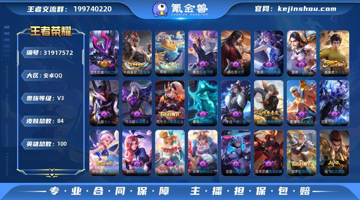 安卓Q-V3-最强王者段位-100英雄-84皮肤-1珍品传说-3传说-24史诗【珍品传说】:伽罗沧流箭【传说皮肤】:马超神骥逐星野,干将莫邪久胜战神,宫本武藏地狱之眼【限定皮肤】:姜子牙天穹之誓,狄仁杰阴阳师,高渐离玩趣恶龙,元歌无心,裴擒虎李小龙,桑启海盐诗旅,阿古朵江河有灵,张良古海寻踪,鬼谷子天穹祈灯,刘邦剑破天穹,周瑜熔金海岸【赛季限定】:桑启海盐诗旅,张良古海寻踪,鬼谷子天穹祈灯,刘邦剑破天穹,姜子牙天穹之誓,东皇太一噬灭天穹,太乙真人谧流熔炉,钟馗虚灵犬护,甄姬逆浪荇歌,亚瑟荣光之誓【战令限定】:周瑜线条小狗【史诗皮肤】:周瑜线条小狗,黄忠百相守梦,阿古朵江河有灵,元歌无心,司马懿暗渊魔法,裴擒虎李小龙,橘右京修罗,狄仁杰鹰眼统帅,伽罗箭羽风息,孙策猫狗日记,阿轲节奏热浪,程咬金功夫厨神,百里守约特工魅影,亚瑟心灵战警,夏侯惇乘风破浪,花木兰水晶猎龙者,张飞乱世虎臣,李白千年之狐,曹操幽灵船长,嬴政摇滚巨星,孙尚香水果甜心,宫本武藏鬼剑武藏,王昭君偶像歌手,甄姬冰雪圆舞曲,露娜紫霞仙子【其他皮肤】:鲁班七号班班快跑,虞姬溯影追猎,艾琳鹤鸣心笺,张良罗小黑战记,亚瑟荣光之誓,哪吒罗小黑战记,鬼谷子克喵,莱西奥踏浪烽翎,甄姬逆浪荇歌,白起死霸装,姬小满小满鸭,露娜命运加冕,阿古朵布丁狗之约,张良灵野札记,苏烈春野闲踪,钟馗虚灵犬护,太乙真人谧流熔炉,东皇太一噬灭天穹,周瑜熔金海岸,姜子牙天穹之誓,刘邦剑破天穹,鬼谷子天穹祈灯,张良古海寻踪,赵怀真太极少年,桑启海盐诗旅,程咬金无双福将,高渐离玩趣恶龙,吕布野性能量,诸葛亮掌控之力,老夫子功夫老勺,钟无艳海滩丽影,刘备纽约教父,狄仁杰阴阳师,宫本武藏万象初新,亚瑟死亡骑士,安琪拉玩偶对对碰,赵云白执事,韩信街头霸王,韩信教廷特使,司空震启...
