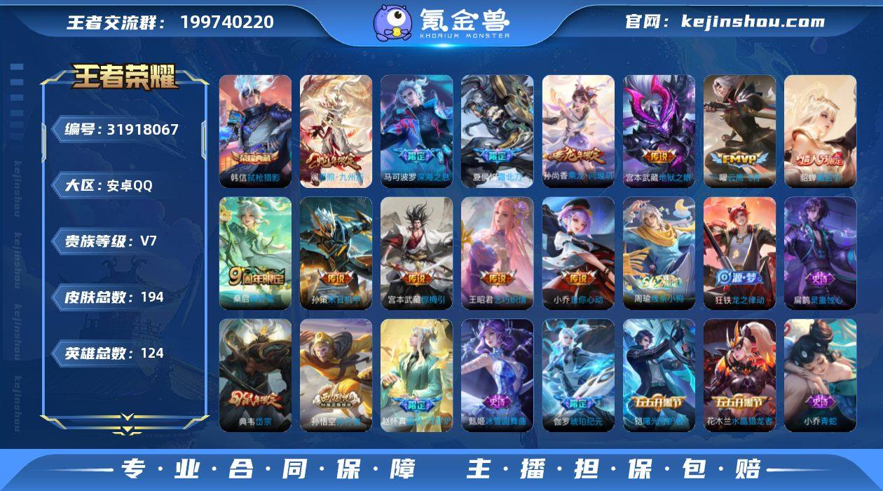 安卓Q-V7-最强王者段位-124英雄-194皮肤-1典藏皮肤-12传说-51史诗【英雄全皮】:孙权全皮,阿古朵全皮【荣耀典藏】:韩信弑枪猎影【传说皮肤】:澜愿照九州拓,桑启鸣野蒿,夏侯惇霜北刀,貂蝉曦玄引,孙尚香乘龙问璇玑,宫本武藏惊梅引,马可波罗深海之息,孙策末日机甲,王昭君乞巧织情,小乔音你心动,曜云鹰飞将,宫本武藏地狱之眼【限定皮肤】:夏侯惇霜北刀,蒙犽顽岩魄,蔡文姬夏日便利店,大乔绒语心约,虞姬夏日便利店,姜子牙天穹之誓,狄仁杰阴阳师,赵云皇家上将,孙尚香蔷薇恋人,典韦岱宗,马可波罗深海之息,狄仁杰魔术师,项羽海滩派对,老夫子航海奇遇记,关羽百相守梦,孙悟空孙行者,杨玉环遇见飞天,裴擒虎擒涛扼浪,云中君纤云弄巧,嫦娥拒霜思,鲁班大师探海日志,桑启海盐诗旅,阿古朵江河有灵,张良古海寻踪,蒙犽百解令,蒙恬荣光圣徽,高渐离燃音魔法,妲己灵卜魔法,鬼谷子天穹祈灯,伽罗琥珀纪元,孙尚香乘龙问璇玑,貂蝉曦玄引,沈梦溪龙舞盛年,鲁班七号蔬乡物语,李元芳蔬乡物语,刘邦剑破天穹,程咬金群星魔术团,周瑜熔金海岸【年限皮肤】:典韦岱宗,孙尚香乘龙问璇玑,澜愿照九州拓【赛季限定】:桑启海盐诗旅,裴擒虎擒涛扼浪,鲁班大师探海日志,张良古海寻踪,鬼谷子天穹祈灯,刘邦剑破天穹,姜子牙天穹之誓,太乙真人谧流熔炉,亚瑟荣光之誓,蒙恬荣光圣徽【战令限定】:老夫子航海奇遇记,高渐离燃音魔法,妲己灵卜魔法,鲁班七号蔬乡物语,李元芳蔬乡物语,蔡文姬夏日便利店,虞姬夏日便利店,孙膑茶境仙,马超访茗客,周瑜线条小狗【史诗皮肤】:周瑜线条小狗,扁鹊灵蛊蚀心,狂铁龙之律动,赵怀真器灵浮梦炉,孙膑茶境仙,蒙犽顽岩魄,蔡文姬夏日便利店,鲁班七号蔬乡物语,伽罗琥珀纪元,蒙恬荣光圣徽,高渐离燃音魔法,妲己灵卜魔法,蒙犽百解令,阿古朵江河有灵,...