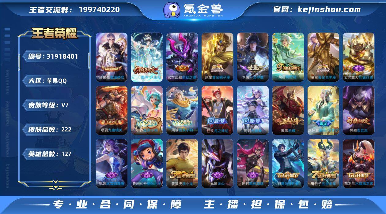 苹果Q-V7-最强王者段位-127英雄-222皮肤-1典藏皮肤-6传说-54史诗 【英雄全皮】:苏烈全皮,影全皮 【荣耀典藏】:诸葛亮星域神启 【传说皮肤】:妲己愿照众生和,桑启鸣野蒿,李信一念神魔,张良黄金白羊座,达摩黄金狮子座,宫本武藏地狱之眼 【限定皮肤】:狄仁杰阴阳师,赵云皇家上将,妲己热情桑巴,嬴政优雅恋人,鲁班七号狮舞东方,庄周高山流水,高渐离玩趣恶龙,阿轲迷踪丽影,元歌无心,夏侯惇朔风刀,狄仁杰魔术师,狄仁杰万华元夜,达摩沙漠行僧,项羽海滩派对,老夫子醍醐杖,程咬金演武夺筹,兰陵王金庭之子,牛魔御旌,李元芳银河之约,李元芳云中旅人,钟馗神迹守卫,钟馗驱傩正仪,鬼谷子原初探秘者,鬼谷子五谷丰年,黄忠烈魂,苏烈玄武志,苏烈千军破阵,百里玄策原初追逐者,弈星混沌棋,沈梦溪星空之诺,沈梦溪大漠名商,明世隐疑决卦,裴擒虎李小龙,裴擒虎擒涛扼浪,狂铁御狮,米莱狄御霄,云中君纤云弄巧,盾山御銮,上官婉儿梁祝,鲁班大师探海日志,桑启海盐诗旅,阿古朵江河有灵,张良古海寻踪,蒙犽百解令,鬼谷子天穹祈灯,周瑜熔金海岸 【年限皮肤】:苏烈玄武志,妲己愿照众生和 【赛季限定】:狂铁御狮,米莱狄御霄,牛魔御旌,盾山御銮,夏侯惇朔风刀,弈星混沌棋,明世隐疑决卦,老夫子醍醐杖,鬼谷子原初探秘者,狄仁杰万华元夜,程咬金演武夺筹,钟馗驱傩正仪,苏烈千军破阵,达摩沙漠行僧,兰陵王金庭之子,沈梦溪大漠名商,李元芳云中旅人,桑启海盐诗旅,裴擒虎擒涛扼浪,鲁班大师探海日志,张良古海寻踪,鬼谷子天穹祈灯,东皇太一噬灭天穹,太乙真人谧流熔炉,钟馗虚灵犬护,亚瑟荣光之誓,百里玄策原初追逐者,项羽九幽镇关 【战令限定】:鲁班七号狮舞东方,钟馗神迹守卫,李元芳银河之约,沈梦溪星空之诺,阿轲迷踪丽影,廉颇撼地雄心,百里守约百相守梦,老夫子百相...