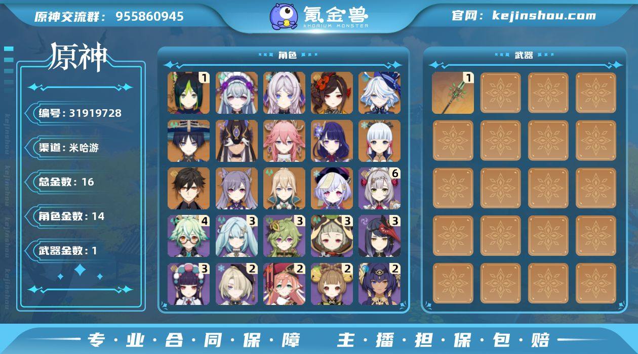 冒险等阶56,16黄,14金角色,1金色武器,345个原石,0命芙宁娜,0命茜特菈莉,0命钟离,0命雷电将军,0命流浪者,0命神里绫华,0命八重神子,0命千织,1命提纳里,0命琴,其他角色武器详情看图.