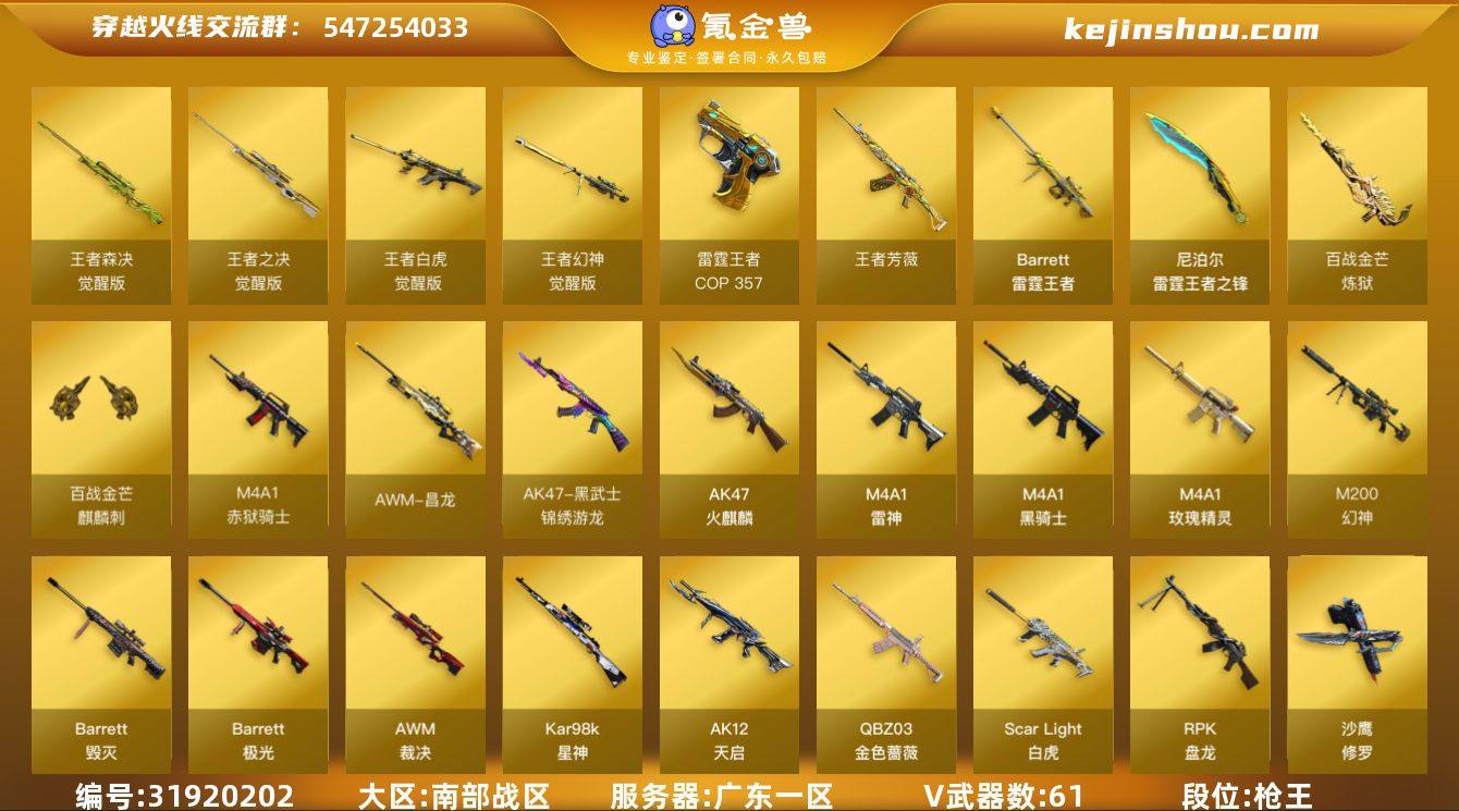 广东一区-68V-17王者-0炫金 【热门武器】:G36C-幻影,QBZ03-金色蔷薇,Scar Light-白虎,M200-幻神,M200-竞技荣光,荣耀世冠-柯尔特,Kar98K-星神,M4A1-黑骑士,RPK-盘龙,毁灭-孙三炮,裁决-雪莉杨,COP-白鲨,COP 357-雷霆王者,沙鹰-修罗*3,Knife-冠军之刃,炽芒蝶刃,炽芒蝶刃-冠军炽芒皮肤 【王者炫金武器】:王者芳薇,Barrett-雷霆王者,COP 357-雷霆王者,雷霆王者之锋*2 【音效卡】:AWM-裁决音效卡,Barrett-碧霄极光音效卡,白虎-盛典舞曲音效卡,炼狱-百战金芒-庆典舞曲音效卡,柯尔特-百战金芒-庆典舞曲音效卡,AWM-昌龙-怀旧音效卡 【皮肤】:M200-幻神-黄忠皮肤,幻神-Heartshot 皮肤,幻神-星火小队签名臻藏版 皮肤,幻神-曹操 皮肤,金色蔷薇-破浪逐光 皮肤,QBZ03-荣耀世冠EP 皮肤,裁决-叶芒苍灵 皮肤,星神-璀璨皮肤,Kar98K-星神-AG-CFPLS21冠军皮肤,星神-巅峰荣耀 皮肤,雷神-传奇N9,M4A1-战神赵云,雷神-航星皮肤,M4A1-再燃火线,火麒麟-战神关羽,火麒麟-盘古,火麒麟-白虎,毁灭-暗月,毁灭-战神张飞,毁灭-英雄计划 皮肤,黑龙-冠军之武,屠龙-春桃 皮肤,屠龙-破浪逐光 皮肤*2,轻型军用手斧-再燃火线,炽芒蝶刃-冠军炽芒皮肤 【角色】:电竞教官-云悠悠,晴雅,岚兮儿,妮妮,战地猎狐,王者零-华冠丽服,王者炫,王者-魅影,王者雾萌萌,王者雨墨,奇洋探员,暗夜-X,初恋灵狐,芳心审判者,飞虎队-X,风暴女,葵-赛博朋克,猎狐者-追月,灵狐者-X,灵狐者-黄金海岸,玫瑰花神,娜塔莉娅,潘多拉-甜心教官,兔囡囡,樱-战斗天使,影武者-X,游珑儿 【人偶武器】:COP-白鲨,毁灭-孙三炮,裁决-雪莉杨,星神-炽天使,巴雷特-零-水下丽影,Scar Light-马枪,USP-铃狮送福,AWM-灵狐-15周年嘉年华,COP-旗袍,迷你裂空之翼,迷你波特博士*3,迷你曼提柯尔,迷你牛牛,迷你火种,...