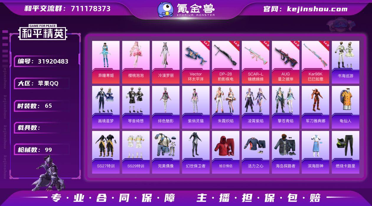 苹果 手Q-3粉装-6特效枪-0载具-3粉色飞行器-30315热力值-5王牌印记-65套装-99枪皮 【热门品类】:角色-军刀雅典娜,套装-龟仙人 【粉色套装】:角色-樱桃泡泡,角色-冷漠罗丽,角色-异瞳寒姬 【粉色枪皮等级】:SCAR-L-锦绣绵绵(五级),AUG-星之彼岸(五级),Vector-环太平洋(七级),Kar98K-巳巳如意(五级),Mk14-福马献瑞(四级),DP-28-豹影疾电(五级) 【粉色枪皮】:SCAR-L-锦绣绵绵,AUG-星之彼岸,Vector-环太平洋,Kar98K-巳巳如意,Mk14-福马献瑞,DP-28-豹影疾电 【粉色飞行器】:炫彩糖果飞行器,星之彼岸飞行器,极意拳锋飞行器 【粉色降落伞】:星之彼岸降落伞,环太平洋降落伞,樱桃泡泡降落伞,冷漠罗丽降落伞,异瞳寒姬降落伞,炫彩糖果降落伞 【稀有套装】:套装-龟仙人,套装-雪国风尚,套装-炫彩糖果,套装-马上来财,套装-朱霞炽焰,套装-凌霄紫焰,套装-擎苍青焰,角色-绯色魅影,角色-紫俏灵猫,套装-书海巡游,套装-画境星梦,套装-琴音绮想,套装-红釉青花 【稀有枪皮】:AUG-冰晶雪宝,AKM-星之彼岸,AKM-环太平洋,AKM-破晓战魂,M16A4-幻世战舞者,SCAR-L-炫彩节奏,SCAR-L-玉兔迎春,M416-红色方程式,GROZA-暮色玫影,AUG-天降萌叽,蜜獾-天降萌叽,ACE32-画境星梦,ARX-凌霄紫焰,UZI-红色方程式,Vector-焰鹰斗篷,汤姆逊-环太平洋,MP5K-画境星梦,JS9-凌霄紫焰,P90-巳巳如意,AWM-焰鹰斗篷,VSS-星之彼岸,MK20-H-樱桃泡泡,M1加兰德-画境星梦,S686-生命誓言,S1897-炫彩节奏,S1897-荧海星豚,DBS-焰鹰斗篷,AA12-G-画境星梦,M249-彩虹符号,M249-星之彼岸,DP-28-焰鹰斗篷,MG3-幻世战舞者,MG-36-凌霄紫焰,P92-凌霄紫焰,大砍刀-鬼刀,平底锅-凌霄紫焰,平底锅-画境星梦,破片手榴弹-巳巳如意 【其他套装】:套装-SS27特训,套装-SS29特训,套装-完美偶像,套装-幻世保卫者,...