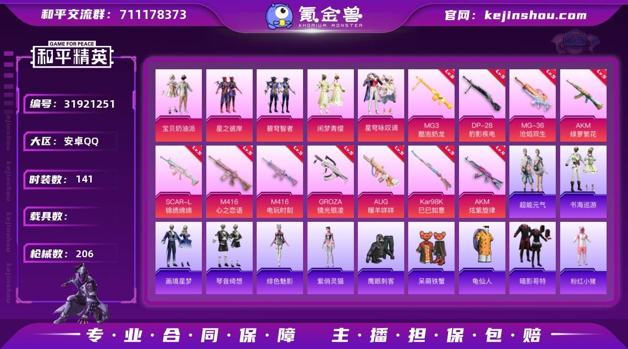 【ky37】安卓 手Q-5粉装-12特效枪-0载具-3粉色飞行器-64977热力值-12王牌印记-141套装-206枪皮 【热门品类】:套装-龟仙人,套装-暗影哥特,套装-粉红小猪,角色-Mark.06 【粉色套装】:粉装-宝贝奶油派,粉装-星之彼岸,粉装-碧穹智者,粉装-闲梦青缨,粉装-星穹咏叹调 【粉色枪皮等级】:AKM-炫紫旋律(四级),AKM-绿萝繁花(五级),SCAR-L-锦绣绵绵(五级),M416-心之恋语(五级),M416-电玩时刻(五级),GROZA-镜光银凌(五级),AUG-暖羊咩咩(五级),AKS-74U-森灵之息(五级),Kar98K-巳巳如意(五级),DP-28-豹影疾电(五级),MG3-酷泡奶龙(六级),MG-36-沧焰双生(五级) 【粉色枪皮】:AKM-炫紫旋律,AKM-绿萝繁花,SCAR-L-锦绣绵绵,M416-心之恋语,M416-电玩时刻,GROZA-镜光银凌,AUG-暖羊咩咩,AKS-74U-森灵之息,Kar98K-巳巳如意,DP-28-豹影疾电,MG3-酷泡奶龙,MG-36-沧焰双生 【粉色飞行器】:繁龙极客飞行器,万象金身飞行器 【粉色降落伞】:恐龙拽拽降落伞,妙趣可丽降落伞,闲梦青缨降落伞,猪猪侠降落伞,幻影飞狐降落伞,星穹咏叹调降落伞,异瞳寒姬降落伞,炫彩糖果降落伞 【稀有套装】:套装-龟仙人,套装-巳巳如意,套装-超能元气,套装-雪国风尚,套装-炫彩糖果,套装-燕燕于飞,套装-鱼渊荷华,套装-晶辉守护,套装-旋风灵鼠,角色-幽秘之星,角色-冷霜之星,套装-粉恋花,套装-紫幽梦,套装-蓝冰羽,套装-星渊小夜曲,角色-绯色魅影,角色-紫俏灵猫,套装-书海巡游,套装-画境星梦,套装-琴音绮想,套装-红釉青花 【稀有枪皮】:AUG-冰晶雪宝,AKM-恐龙拽拽,AKM-灼热熔岩,AKM-虎虎生威,AKM-龙的传人,M16A4-幻世战舞者,M16A4-甜心亚梦,SCAR-L-暗夜玫瑰,SCAR-L-炫彩节奏,SCAR-L-玉兔迎春,SCAR-L-龙宫之主,M416-绯红前夜,M416-蓝色火焰,GROZA-彩虹符号,GROZA-懵萌河马,AUG-天降萌叽,A...