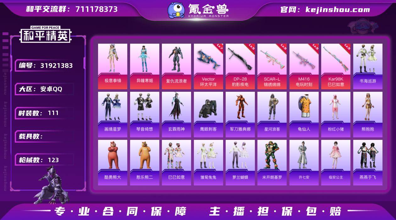 安卓 手Q-无敌战神框-3粉装-6特效枪-0载具-0粉色飞行器-42671热力值-7王牌印记-106套装-128枪皮 QW263701 【热门品类】:套装-浪漫天命,套装-深海小丑鱼,套装-AG战队服,套装-龟仙人,套装-暗影哥特,角色-Mark.06 【粉色套装】:粉装-绚金战神,角色-洛天依,角色-荧海星豚 【粉色枪皮等级】:SCAR-L-锦绣绵绵(五级),M416-电玩时刻(五级),AUG-暖羊咩咩(五级),M762-鬼刀(七级),Kar98K-巳巳如意(五级),S12K-海渊国主(六级) 【粉色枪皮】:SCAR-L-锦绣绵绵,M416-电玩时刻,AUG-暖羊咩咩,M762-鬼刀,Kar98K-巳巳如意,S12K-海渊国主 【粉色降落伞】:海渊国主降落伞,炫光之旅降落伞,猪猪侠降落伞,江南烟雨降落伞,千金淑猫降落伞,临安公主降落伞,雪月幻音降落伞,时光之吻降落伞,荧海星豚降落伞 【稀有套装】:套装-龟仙人,套装-炽纹蛇影,套装-巳巳如意,套装-小鸟芋圆,套装-燕燕于飞,套装-鱼渊荷华,套装-粉恋花,套装-紫幽梦,套装-蓝冰羽,套装-星影赞美诗,套装-极速光影 【稀有枪皮】:AKM-彩虹符号,AKM-破晓战魂,AKM-霓虹街区,M16A4-红色方程式,SCAR-L-玉兔迎春,SCAR-L-红色方程式,SCAR-L-冷漠罗丽,M416-糯团青竹,M416-红色方程式,M416-蓝色火焰,GROZA-彩虹符号,GROZA-恐龙拽拽,GROZA-懵萌河马,GROZA-田园牧歌,AUG-耀粉歌者,Mk47-妙红点点,AC-VAL-天降萌叽,AC-VAL-快闪甜心,蜜獾-天降萌叽,蜜獾-娇憨猪猪,UZI-啾咪啾咪,UZI-天降萌叽,UZI-娇憨猪猪,UMP45-猪猪侠,UMP45-生命誓言,Vector-焰鹰斗篷,Vector-田园牧歌,汤姆逊-炫彩节奏,汤姆逊-耀粉歌者,P90-快闪甜心,P90-巳巳如意,Kar98K-彩虹符号,Kar98K-炫彩节奏,AWM-焰鹰斗篷,VSS-田园牧歌,Mini14-耀粉歌者,SLR-娇憨猪猪,AMR-妙红点点,M417-猪猪侠,MK20-H-快闪甜心,S686-生命誓言,S686-红色方程式,S6...