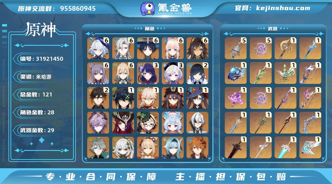 邮箱: 未绑定 总黄数: 121 冒险等级: 60 6命金色角色: 满命刻晴,满命琴,满命珊瑚宫心海,满命流浪者,满命迪希雅,满命那维莱特,满命芙宁娜 3命金色角色: 三命七七,三命雷电将军 2命金色角色: 二命钟离,二命夜兰 1命金色角色: 一命枫原万叶,一命莫娜,一命胡桃,一命基尼奇 0命金色角色: 迪卢克,优菈,宵宫,可莉,达达利亚,提纳里,纳西妲,艾尔海森,阿蕾奇诺,希格雯,艾梅莉埃,恰斯卡,杜林 拥有武器: 狼的末路,天空之翼,飞雷之弦振,四风原典,天空之卷,和璞鸢,天空之傲,风鹰剑,天空之刃,贯虹之槊,薙草之稻光,不灭月华,苍古自由之誓,冬极白星,神乐之真意,若水,千夜浮梦,图莱杜拉的回忆,裁叶萃光,万世流涌大典,静水流涌之辉,裁断 5精武器: 不灭月华,图莱杜拉的回忆 1精武器: 狼的末路,天空之翼,飞雷之弦振,四风原典,天空之卷,和璞鸢,天空之傲,风鹰剑,天空之刃,贯虹之槊,薙草之稻光,不灭月华,苍古自由之誓,冬极白星,神乐之真意,若水,千夜浮梦,裁叶萃光,万世流涌大典,静水流涌之辉,裁断