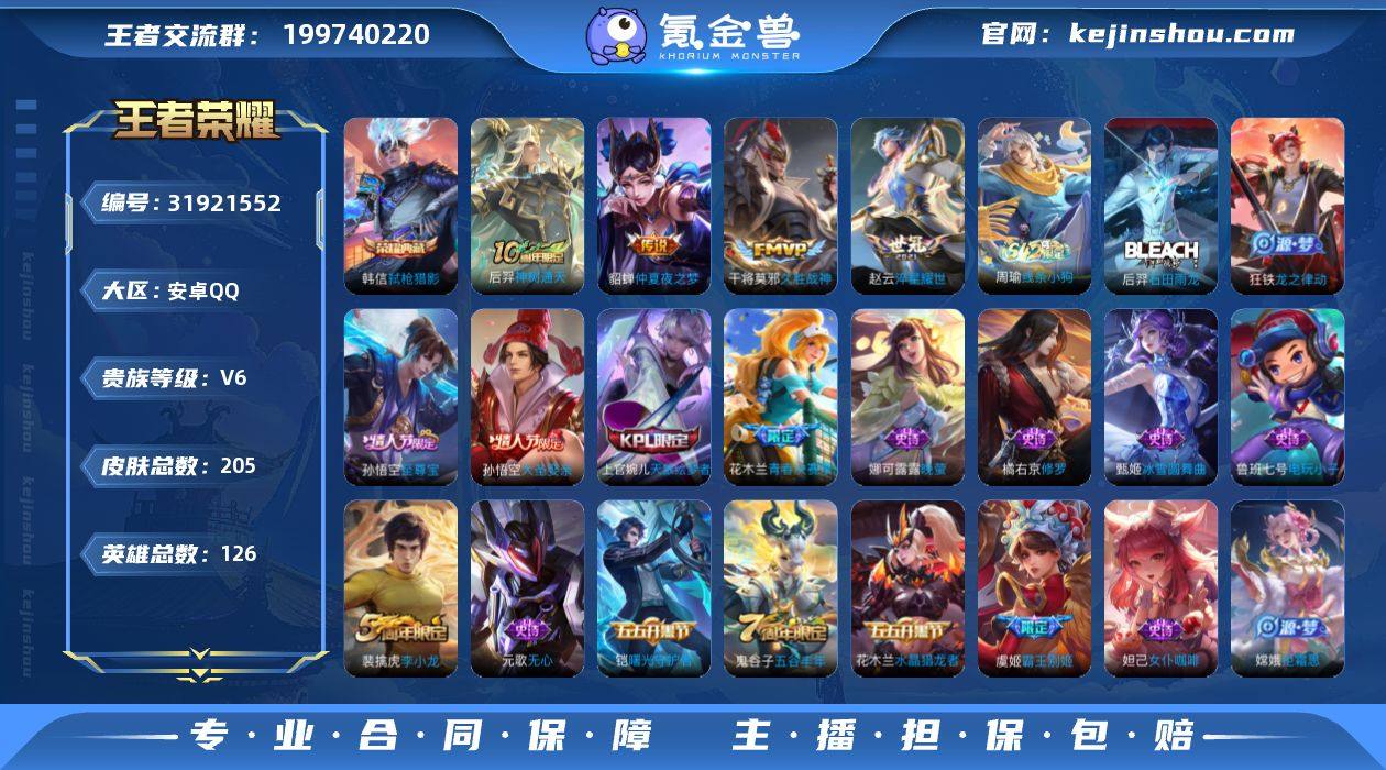 安卓Q-V6-荣耀黄金I段位-126英雄-205皮肤-1典藏皮肤-4传说-57史诗 【荣耀典藏】:韩信弑枪猎影 【传说皮肤】:后羿神树通天,赵云淬星耀世,干将莫邪久胜战神,貂蝉仲夏夜之梦 【限定皮肤】:白起狰,狄仁杰阴阳师,虞姬凯尔特女王,赵云皇家上将,孙尚香蔷薇恋人,鲁班七号狮舞东方,高渐离死亡摇滚,阿轲迷踪丽影,芈月重明,元歌无心,夏侯惇朔风刀,甄姬游园惊梦,曹操烛龙,典韦穷奇,狄仁杰魔术师,狄仁杰万华元夜,达摩沙漠行僧,项羽海滩派对,老夫子醍醐杖,程咬金演武夺筹,刘邦夺宝奇兵,兰陵王金庭之子,花木兰青春决赛季,孙悟空至尊宝,孙悟空大圣娶亲,牛魔御旌,李元芳云中旅人,虞姬霸王别姬,钟馗神迹守卫,钟馗驱傩正仪,杨玉环遇见飞天,干将莫邪胡桃夹子,太乙真人饕餮,鬼谷子原初探秘者,鬼谷子五谷丰年,苏烈千军破阵,弈星混沌棋,梦奇顽趣,沈梦溪大漠名商,明世隐疑决卦,裴擒虎李小龙,裴擒虎擒涛扼浪,狂铁御狮,米莱狄御霄,伽罗天狼溯光者,盾山御銮,上官婉儿梁祝,上官婉儿天狼绘梦者,嫦娥拒霜思,鲁班大师探海日志,桑启海盐诗旅,张良古海寻踪,鬼谷子天穹祈灯,刘邦剑破天穹 【赛季限定】:虞姬凯尔特女王,白起狰,太乙真人饕餮,曹操烛龙,芈月重明,典韦穷奇,狂铁御狮,米莱狄御霄,牛魔御旌,盾山御銮,夏侯惇朔风刀,弈星混沌棋,明世隐疑决卦,老夫子醍醐杖,鬼谷子原初探秘者,狄仁杰万华元夜,程咬金演武夺筹,钟馗驱傩正仪,苏烈千军破阵,达摩沙漠行僧,兰陵王金庭之子,沈梦溪大漠名商,李元芳云中旅人,桑启海盐诗旅,裴擒虎擒涛扼浪,鲁班大师探海日志,张良古海寻踪,鬼谷子天穹祈灯,刘邦剑破天穹,东皇太一噬灭天穹,梦奇顽趣 【战令限定】:鲁班七号狮舞东方,钟馗神迹守卫,阿轲迷踪丽影,刘邦夺宝奇兵,周瑜线条小狗 【史诗皮肤】:周瑜线条小狗,后羿...