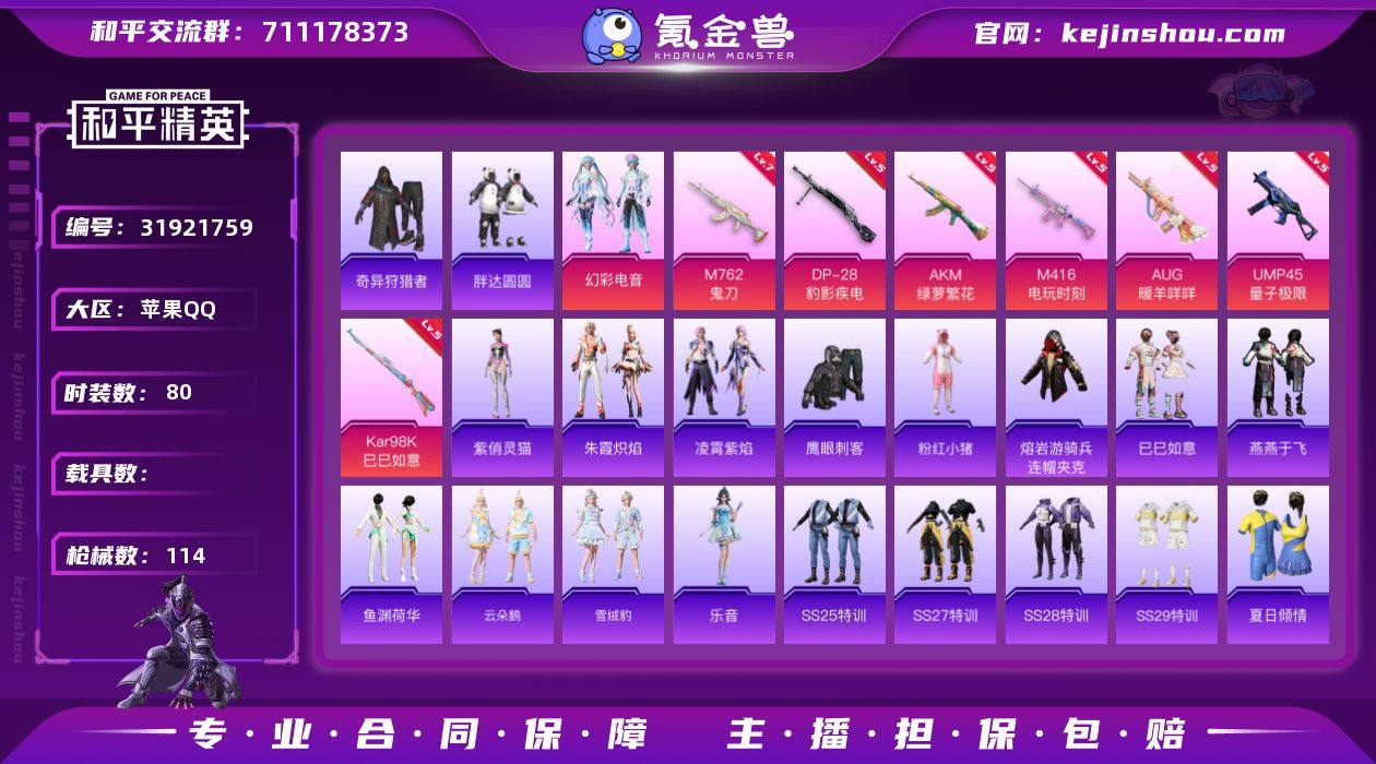 【ky77】苹果 手Q-1粉装-8特效枪-0载具-1粉色飞行器-33410热力值-8王牌印记-80套装-114枪皮 【热门品类】:套装-奇异狩猎者,套装-胖达圆圆,套装-粉红小猪,熔岩游骑兵连帽夹克 【粉色套装】:粉装-幻彩电音 【粉色枪皮等级】:AKM-绿萝繁花(五级),M416-电玩时刻(五级),AUG-暖羊咩咩(五级),M762-鬼刀(七级),UMP45-量子极限(五级),AKS-74U-森灵之息(五级),Kar98K-巳巳如意(五级),DP-28-豹影疾电(五级) 【粉色枪皮】:AKM-绿萝繁花,M416-电玩时刻,AUG-暖羊咩咩,M762-鬼刀,UMP45-量子极限,AKS-74U-森灵之息,Kar98K-巳巳如意,DP-28-豹影疾电 【粉色降落伞】:极限特训降落伞,幻影战神降落伞,闲梦青缨降落伞,精灵梦叶罗丽降落伞,月影灵韵降落伞,异瞳寒姬降落伞,炫彩糖果降落伞 【稀有套装】:套装-巳巳如意,套装-雪国风尚,套装-炫彩糖果,套装-燕燕于飞,套装-鱼渊荷华,套装-云朵鹅,套装-雪绒豹,角色-乐音,套装-朱霞炽焰,套装-凌霄紫焰,角色-紫俏灵猫 【稀有枪皮】:AKM-影袭,AKM-龙的传人,M16A4-幻世战舞者,SCAR-L-夜灯,SCAR-L-炫彩节奏,M416-糯团青竹,M416-蓝色火焰,GROZA-2B战斗服款,GROZA-影袭,AUG-天降萌叽,AUG-甜蜜菠萝,QBZ-彩虹符号,QBZ-相思残雪,M762-天降萌叽,M762-云朵鹅,AC-VAL-天降萌叽,AC-VAL-闲梦青缨,蜜獾-天降萌叽,ARX-凌霄紫焰,UZI-天降萌叽,UZI-幻影战神,UZI-影袭,UMP45-夜灯,Vector-焰鹰斗篷,汤姆逊-天降萌叽,AKS-74U-鬼刀,JS9-凌霄紫焰,P90-巳巳如意,M24-影袭,AWM-焰鹰斗篷,SKS-炫彩节奏,Mini14-炫彩节奏,M417-惊鸿侠骨,M200-惊鸿侠骨,SVD-云朵鹅,S686-巳巳如意,S1897-炫彩节奏,S12K-夜灯,DBS-焰鹰斗篷,SPAS-12-云朵鹅,M249-彩虹符号,DP-28-焰鹰斗篷,MG3-幻世战舞者,MG3-惊鸿侠骨,MG-36-凌霄紫焰,P92-凌霄紫焰,沙漠之...