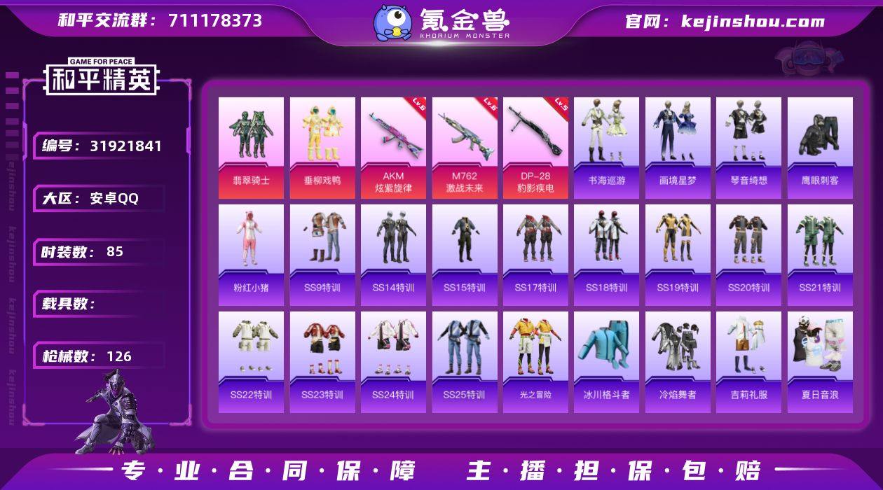 【ky81】安卓 手Q-2粉装-4特效枪-0载具-1粉色飞行器-37666热力值-8王牌印记-85套装-126枪皮 【热门品类】:套装-粉红小猪 【粉色套装】:粉装-翡翠骑士,粉装-垂柳戏鸭 【粉色枪皮等级】:AKM-炫紫旋律(六级),M762-激战未来(六级),AKS-74U-森灵之息(五级),DP-28-豹影疾电(五级) 【粉色枪皮】:AKM-炫紫旋律,M762-激战未来,AKS-74U-森灵之息,DP-28-豹影疾电 【粉色飞行器】:激战未来飞行器 【粉色降落伞】:炫紫旋律降落伞,星之彼岸降落伞,垂柳戏鸭降落伞,暗夜鎏金降落伞,炫光之旅降落伞 【稀有套装】:套装-书海巡游,套装-画境星梦,套装-琴音绮想 【稀有枪皮】:AKM-夜灯,AKM-奇异狩猎者,AKM-星之彼岸,AKM-龙的传人,M16A4-夜灯,M16A4-幻世战舞者,M16A4-甜心亚梦,SCAR-L-炫彩节奏,SCAR-L-玉兔迎春,SCAR-L-红色方程式,M416-夜灯,M416-梨园星光,M416-神秘黑猫,M416-糯团青竹,M416-绯红前夜,M416-蓝色火焰,GROZA-彩虹符号,GROZA-影袭,GROZA-治愈之星,GROZA-田园牧歌,AUG-青春冒险家,QBZ-赛罗,M762-天降萌叽,M762-绯红前夜,Mk47-妙红点点,Mk47-青春冒险家,G36C-炙焰牛王,AC-VAL-天降萌叽,AC-VAL-彩虹甜喵,AC-VAL-甜心亚梦,蜜獾-娇憨猪猪,ACE32-画境星梦,UZI-众神之王,UZI-娇憨猪猪,UZI-金风玉露,UMP45-夜灯,UMP45-蓝色火焰,Vector-彩虹符号,Vector-治愈之星,Vector-田园牧歌,Vector-香水柠檬,汤姆逊-天降萌叽,汤姆逊-耀粉歌者,野牛-王牌四分卫,野牛-青春冒险家,MP5K-众神之王,MP5K-梨园星光,MP5K-画境星梦,P90-筑梦精灵,Kar98K-彩虹符号,Kar98K-炫彩节奏,M24-影袭,M24-治愈之星,M24-炫彩节奏,M24-众神之王,AWM-垂柳戏鸭,AWM-王牌四分卫,SKS-炫彩节奏,SKS-糯团青竹,VSS-星之彼岸,VSS-田园牧歌,Mini14-穿刺龙虾,Mini14-金鼠迎春,Mk14-治愈...