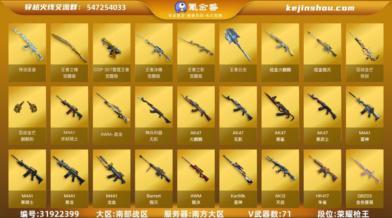 【ky4264】南方大区-75V-8王者-2炫金 【传说武器】:传说圣谕 【热门武器】:传说圣谕,QBZ03-金色蔷薇,Scar Light-白虎,HK417-朱雀,M200-竞技荣光,死亡之眼,Kar98K-星神,金色小号,M4A1-黑骑士,汤姆逊-烈龙*6,加特林-炼狱,斯泰尔-蝴蝶,羊驼玩偶,裁决-雪莉杨,USP-雷暴,沙鹰-修罗,金刚伞*2 【王者炫金武器】:王者云击,炫金火麒麟,炫金毁灭 【音效卡】:AK47-火麒麟音效卡,M4A1-雷神音效卡,M4A1-黑骑士音效卡,Barrett-毁灭音效卡,AWM-裁决音效卡,Barrett-碧霄极光音效卡,麒麟刺-百战金芒-盛典舞曲音效卡,白虎-盛典舞曲音效卡,炼狱-百战金芒-庆典舞曲音效卡,沙鹰-修罗-盛典舞曲音效卡,AWM-昌龙-怀旧音效卡 【皮肤】:裁决-运输船 皮肤,裁决-胜者为王 皮肤,雷神-荣耀之魄,M4A1-再燃火线,火麒麟-雷神,火麒麟-心动糖果,毁灭-星空,毁灭-风暴,M4A1-千变-孔明皮肤,黑龙-墨子皮肤,黑骑士-地狱火,黑武士-典韦皮肤,屠龙-荣耀之锋,轻型军用手斧-再燃火线 【角色】:电竞教官-云悠悠,鹰,战地猎狐,王者-瞳-闭月羞花,王者葵-惊若翩鸿,暗夜-X,初恋灵狐,嘉年华灵狐,灵狐者-X,流浪蔷薇,龙儿-小淘气,潘多拉-X,青霞仙子,斯沃特-X,蜀雪,铁骑荣耀,游珑儿 【人偶武器】:裁决-雪莉杨,斯泰尔-蝴蝶,AWM-灵狐-15周年嘉年华*2,COP-旗袍*2,迷你深渊冰龙,夺魂,迷你牛牛,迷你生化手雷,深渊终结者手雷,灵狐娃娃手雷 【暴走生化】:双面神,死亡之眼,超级对讲机 【挑战大师】:冰龙粉碎者-白马银枪,激光毁灭者III*2,神圣爆裂者-末日III 【英雄级武器】:AK47-火麒麟*2,M4A1-黑龙,M4A1-雷神,M4A1-黑骑士,AK47-无影,AK47-黑武士,AK12-天启,AK47-黑鲨,M4A1-龙血,HK417-朱雀,Scar Light-白虎,无影-神兵利器,QBZ03-金色蔷薇,王者之影-觉醒版,王者冰魄-觉醒版,Barret...