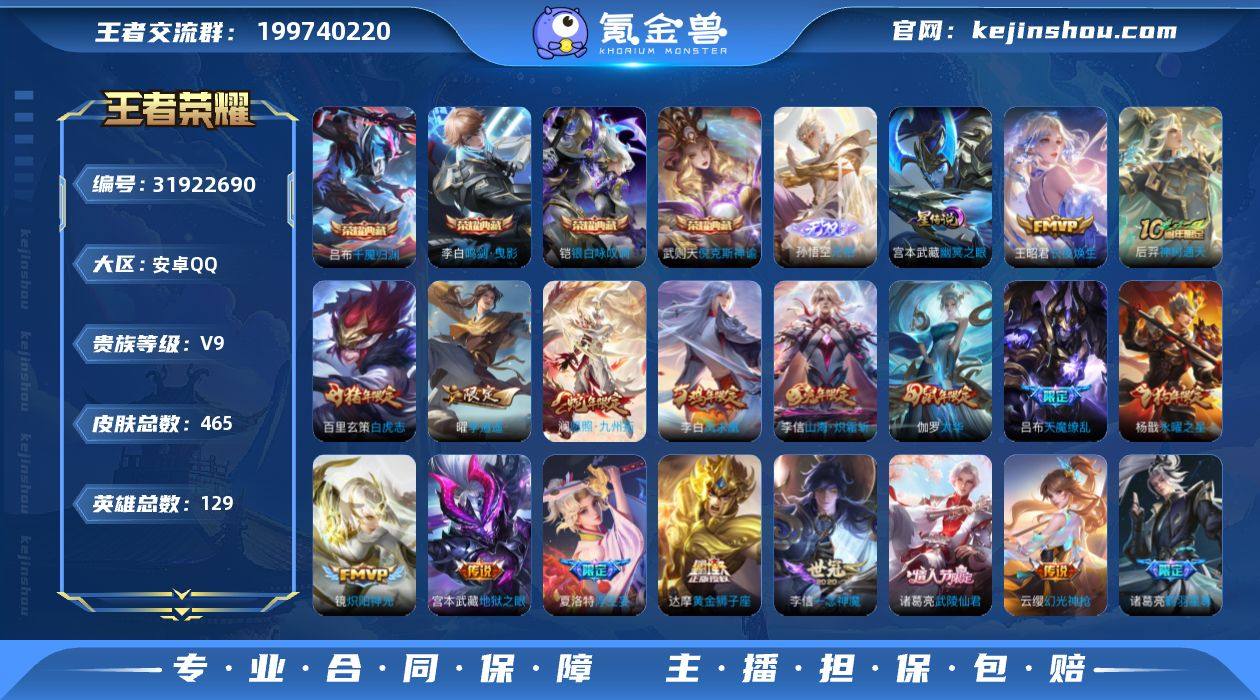 贵族等级:V9 典藏皮肤数:4 珍品无双皮肤数:0 无双皮肤数:1 珍品传说皮肤数:0 传说皮肤数:29 史诗皮肤数:144 皮肤数:465 英雄数:129 段位:荣耀王者 卖家说:全赛季最强王者称号,cfm连体号v9