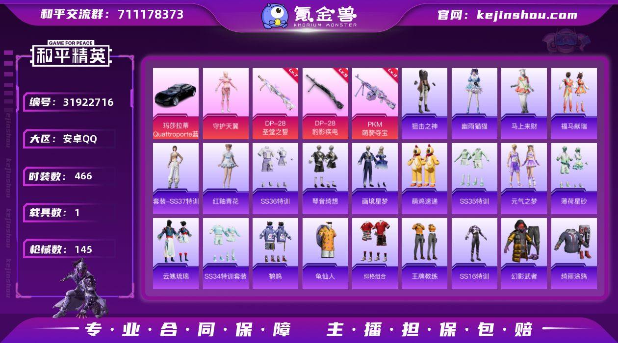 实名:不可二次实名 是否支持人脸包赔:支持 粉装数量:1 特效枪数量:3 载具数:1 时装数:466 枪械数:145 守护天翼 七级DP-28-圣堂之誓,五级DP-28-豹影疾电,三级PKM-萌骑夺宝 玛莎拉蒂Quattroporte(夜幕蓝) 狙击之神,马上来财,幽雨猫猫,福马献瑞,红釉青花,SS37特训,雨过天青,画境星梦,琴音绮想,SS36特训,萌鸡速递,SS35特训,元气之梦,薄荷星砂,云魄琉璃,SS34特训套装,8号机,缤纷果语,滨海假日,冰河战士,爆裂葡萄,白色伏地魔,冰爽海盐,雏菊兔兔,长空猛禽,潮流炫酷,纯真浪花,都市魅力,飞驰魅影,绯格组合,飞狐塔尔斯,粉红小猪,福星高照,飞行日记,格斗先锋,龟仙人,光之冒险,鹤鸣,湖蓝色名流,黑色伏地魔,黄色伏地魔,黄色名流,黄色运动,红色运动,幻世战舞者,和煦暖阳,幻影武者,酒红色名流,橘黑制服,娇憨猪猪,竞技达人朋克,竞技名士,极速红龙,街头潮人,空投萌叽,蓝彩潮人,猎鹰,萝兰蝴蝶,黎明保卫者,蓝色运动,冷焰舞者,Mark.06,猛禽,魅力单车,麻辣教官,懵萌河马,萌趣咩咩,萌趣颜团子,柠萌假日,牛气冲天,牛气满满,破蛋小黄鸡,破晓战魂,轻风白浪,绮丽涂鸦,青年教官,瑞龙福将,热情海星,人气偶像,深蓝色名流,沙漠兵团,神秘领域,神气柴柴,SS15特训,SS16特训,SS17特训,SS18特训,SS19特训,SS20特训,SS21特训,SS22特训,SS23特训,SS24特训,SS25特训,酸甜橘柚,探宝勇士,甜蜜熊情侣,涂山之恋,特训学院,铁血战翼,团圆交子,田园牧歌,特种颜团子,特战装甲,完美偶像,王牌教练,炫蓝之夏,夏日音浪,醒狮腾龙,雪兔飞飞,绚紫流光,耀粉歌者,音速流光,玉兔迎春,野性战心,战地督导,照水倚天,灼焰舞者 光之祷告飞行器,虹云熊熊降落伞,极意拳锋降落伞,炫彩糖果降落伞,初号机 觉醒Ver.降落伞,第五大道降落伞,环太平洋降落伞,圣堂之誓降落伞,音爆索尼克降落伞 卖家说:连体王者v8一个典藏李信无双马可波罗怪盗基德还有20几个年限传说啥的