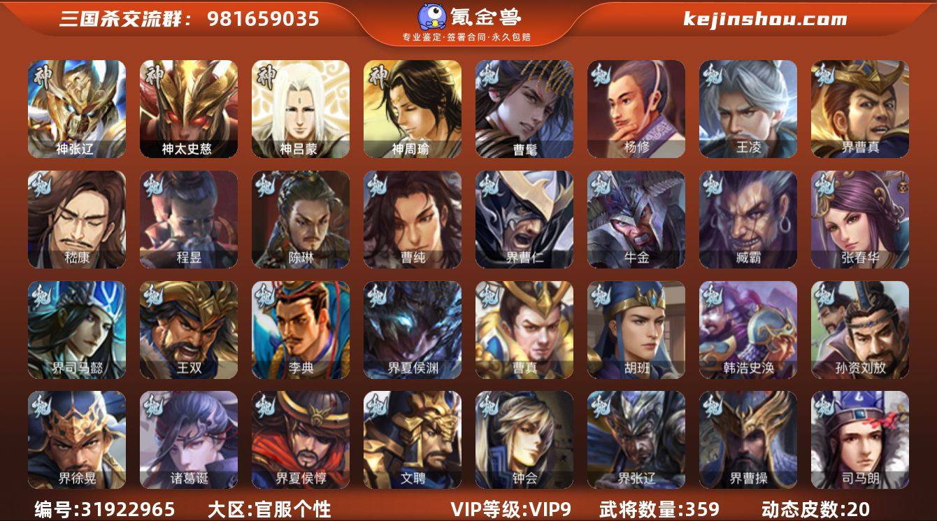 🇨🇳编号1288 三娘 曹髦 谋关羽 谋夏侯氏 大宝 歌王 关索 神太33史诗大将军 道具充足 官方手机格式活绑定账号官阶:大将军;VIP等级:VIP9;史诗武将数量:33;动态皮肤数量:20;武将总数:359;史诗宝珠数量:0;将魂数量:4;神将:2;魏国史诗武将:15;蜀国史诗武将:10;吴国史诗武将:5;群史诗武将:8 神张辽,神太史慈,曹髦,杨修,王凌,界曹真,嵇康,陈琳,曹纯,程昱,关索,马云騄,谋夏侯氏,谋马超,赵襄,张星彩,界黄忠,花鬘,鲍三娘,谋关羽,孙皓,留赞,界朱然,界徐盛,贺齐,左慈,陶谦,审配,麹义,沮授,界左慈,兀突骨,士燮,神吕蒙,神周瑜,SP关羽,SP曹仁,SP蔡文姬,乐进,曹昂,诸葛诞,朱灵,文聘,SP姜维,张春华,钟会,曹冲,郭淮,满宠,界王异,界曹操,界司马懿,界夏侯惇,界张辽,界许褚,界郭嘉,李典,曹真,韩浩史涣,陈群,曹叡,曹休,钟繇,司马朗,王基,李通,郭皇后,孙资刘放,辛宪英,界甄姬,吕虔,鲁芝,蒯越蒯良,界典韦,界荀彧,界徐晃,杜畿,界曹丕,界邓艾,张恭,贾逵,界曹植,界曹彰,界满宠,卞夫人,华歆,王双,崔琰,毛玠,谋徐晃,谋于禁,界曹休,胡班,牛金,界夏侯渊,界曹仁,臧霸,唐咨,SP孙尚香,关银屏,夏侯霸,马良,关兴张苞,廖化,界马岱,关平,简雍,刘封,界法正,界关兴张苞,界刘备,界关羽,界张飞,界赵云,界马超,SP徐庶,吴懿,周仓,张松,刘谌,夏侯氏,糜竺,马忠,孙乾,李严,黄皓,界黄月英,界诸葛亮,赵统赵广,严颜,界伊籍,界卧龙诸葛,界庞统,界孟获,界祝融,陈到,界姜维,界刘禅,胡金定,吕凯,张翼,杨仪,界廖化,邓芝,界简雍,陈震,费祎,糜夫人,王甫赵累,界周仓,向宠,彭羕,界张嶷,谋张飞,诸葛果,界魏延,蒋琬费祎,甘夫人,鲁肃,孙茹,凌操,大乔小乔,诸葛恪,诸葛瑾,孙鲁育,程普,韩当,潘璋马忠,虞翻,朱然,界周泰,界甘宁,界吕蒙,界黄盖,界周瑜,界大乔,界陆逊,孙鲁班,朱桓,顾雍,孙休,朱治,全琮,阚泽,孙登,岑昏,界孙权,界孙尚香,潘濬,孙亮,严畯,界孙坚,吕岱,周鲂,周妃,...