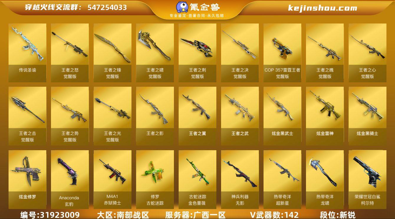 广西一区-157V-21王者武器数-4炫金武器数 【传说武器】:传说圣谕 【热门武器】:传说圣谕,QBZ03-金色蔷薇,Scar Light-白虎,HK417-朱雀,M4A1-青龙,M200-幻神,柯尔特-荣耀世冠白鲨2023,金色蔷薇-古蛇迷踪,修罗-古蛇迷踪,M200-竞技荣光*2,死亡之眼,白虎-电玩蓝兔,Kar98K-星神,金色小号,Cat-刀锋,牛牛-AK47,M4A1-黑骑士*3,汤姆逊-烈龙*7,RPK-盘龙*3,加特林-炼狱*2,COP-白鲨,USP-雷暴,沙鹰-修罗*3,炽芒蝶刃 【王者炫金武器】:王者之翼,王者之武,王者之影,王者冰锋,炫金骑士,炫金雷神,炫金武士,炫金修罗,王者之魄高爆手雷,王者之魄闪光弹,王者之魄烟雾弹 【音效卡】:M200-幻神音效卡,M4A1-雷神音效卡,M4A1-黑龙音效卡,M4A1-黑骑士音效卡,Barrett-毁灭音效卡,Barrett-极光音效卡,AWM-裁决音效卡,Kar98K-星神音效卡,Barrett-碧霄极光音效卡 【皮肤】:幻神-青鹤,幻神-宠儿-2021MVP,M200-幻神-N9-2022MVP,幻神-星火小队签名臻藏版 皮肤,白虎-电玩粉兔皮肤,裁决-流光秘银,烈龙-星空,雷神-虎将,雷神-耀金皮肤,雷神-宠儿-2019MVP,雷神-宇航兔皮肤,火麒麟-轻羽皮肤*2,火麒麟-平天大圣*2,火麒麟-心动糖果,毁灭-荣耀之怒,毁灭耀金皮肤,毁灭-星空,M4A1-千变-孔明皮肤,黑龙-能量核心,黑龙-暗月,黑骑士-暗月,黑骑士-冠军之势,无影-能量核心*2,死神-秘银,战神-粉色甜心皮肤*3,战神-紫绶金章皮肤*2,战神-流金岁月皮肤,AK47-B-常胜将军-曹操*2,AK47-B-常胜将军-刘备,AK47-B-常胜将军-孙权,天龙-秘银*2,天龙-能量核心,AWM-天龙-传奇70KG,极光-能量核心*2,修罗-能量核心*5,屠龙-荣耀之锋 【角色】:樱,魅影,迷迭香,电竞教官-云悠悠,隼,战地猎狐,王者-零-国色天香,王者炫,蛇隐宗,奇洋探员,乔伊教练,修道士,暗夜-X,初恋灵狐,芳心审判者,飞...