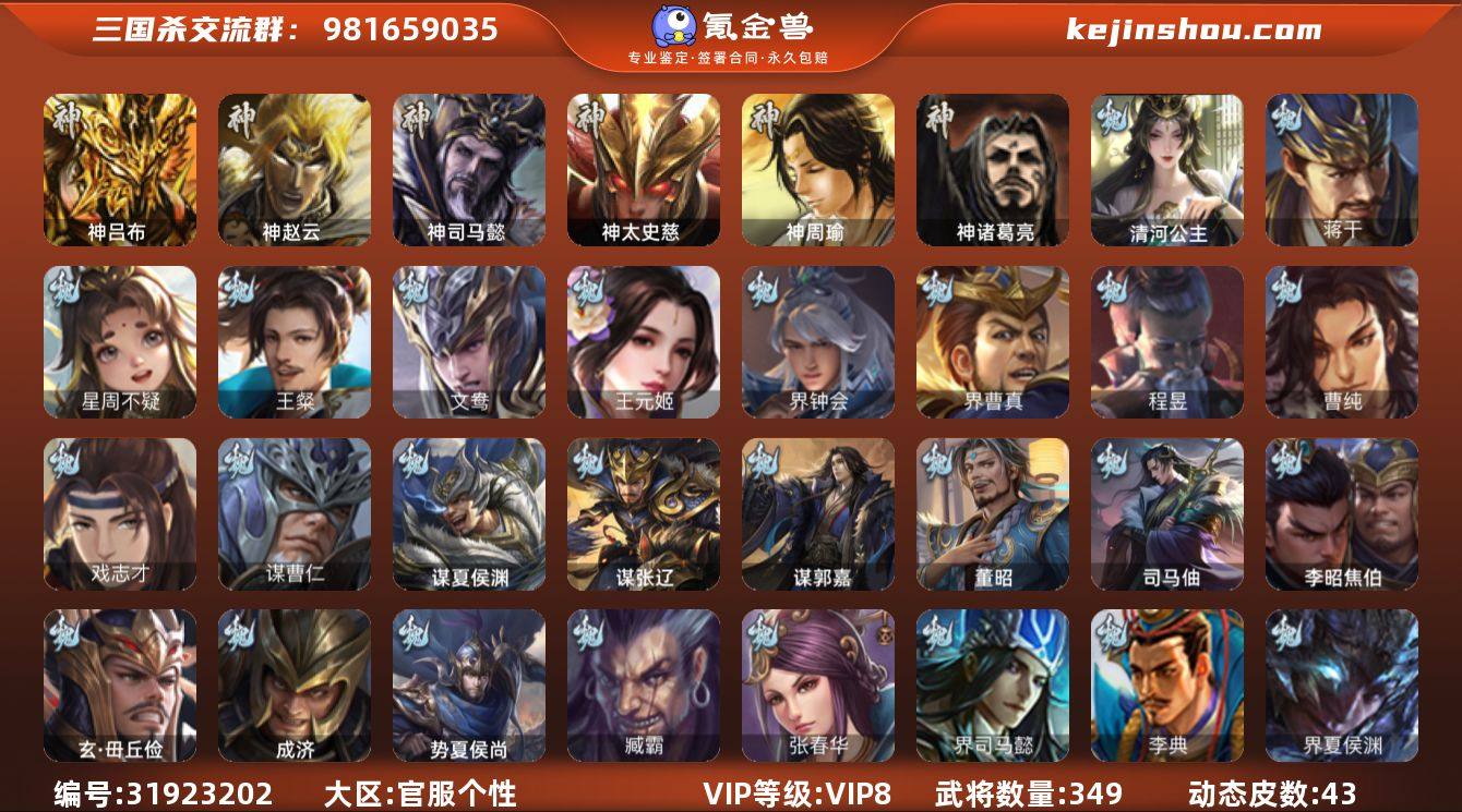 【14789283】官阶:大将军;VIP等级:VIP8;史诗武将数量:43;动态皮肤数量:43;武将总数:349;史诗宝珠数量:0;将魂数量:6800;神将:5;魏国史诗武将:26;蜀国史诗武将:7;吴国史诗武将:9;群史诗武将:14