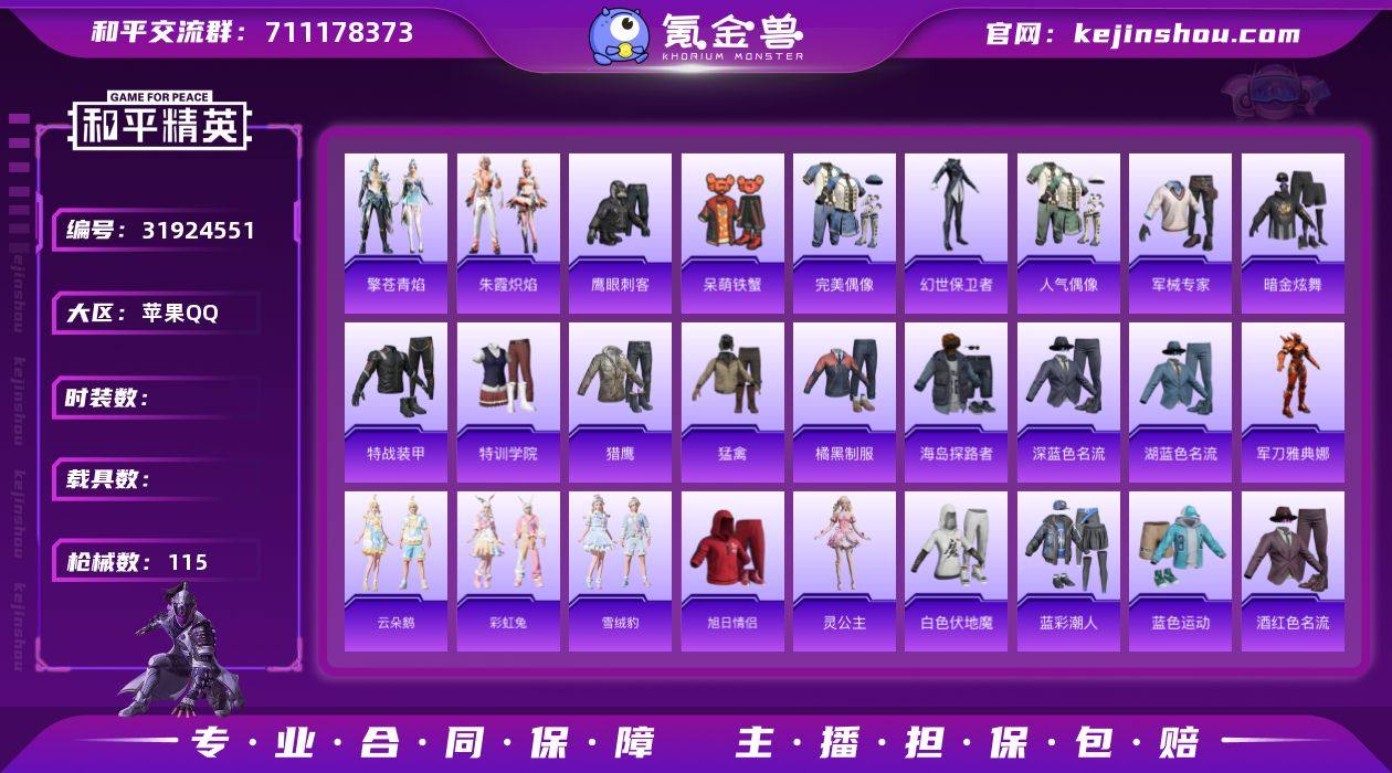 6543【军刀雅典娜1粉装5特效枪1粉色飞行器28777热力值-5王牌印记-82套装-115枪皮】 【热门品类】:角色-军刀雅典娜 【粉色套装】:角色-异瞳寒姬 【粉色枪皮等级】:UMP45-萌骑冒险(三级),AKS-74U-森灵之息(四级),Mk14-福马献瑞(五级),DP-28-豹影疾电(五级),MG-36-沧焰双生(五级) 【粉色枪皮】:UMP45-萌骑冒险,AKS-74U-森灵之息,Mk14-福马献瑞,DP-28-豹影疾电,MG-36-沧焰双生 【粉色飞行器】:炫彩糖果飞行器 【粉色降落伞】:星穹咏叹调降落伞,时光之吻降落伞,智趣喵喵降落伞,宁雨蝶降落伞,荧海星豚降落伞,绯穹魔姬降落伞,喜羊羊与灰太狼降落伞,极意拳锋降落伞,炫彩糖果降落伞 【稀有套装】:套装-小鸟芋圆,角色-超感刻度,套装-雪国风尚,套装-炫彩糖果,角色-X,套装-马上有钱,套装-彩虹兔,套装-云朵鹅,套装-雪绒豹,角色-灵公主,角色-绛羽幽主,套装-朱霞炽焰,套装-凌霄紫焰,套装-擎苍青焰,角色-敖闰,角色-紫俏灵猫,套装-书海巡游,套装-画境星梦,套装-琴音绮想,角色-月烬之祷,套装-雨过天青,套装-红釉青花 【稀有枪皮】:AUG-冰晶雪宝,AKM-影袭,AKM-星之彼岸,AKM-破晓战魂,AKM-龙的传人,AKM-极光猎影,M16A4-幻世战舞者,SCAR-L-夜灯,SCAR-L-炫彩节奏,SCAR-L-玉兔迎春,SCAR-L-红色方程式,M416-红色方程式,M416-蓝色火焰,GROZA-影袭,AUG-耀粉歌者,AUG-绝对恒星,M762-云朵鹅,M762-登顶巅峰,Mk47-洛神天依,G36C-星穹咏叹调,ACE32-画境星梦,ARX-凌霄紫焰,UZI-影袭,UZI-红色方程式,UMP45-夜灯,MP5K-画境星梦,AKS-74U-极光猎影,JS9-凌霄紫焰,Kar98K-影袭,Kar98K-星穹咏叹调,M24-影袭,AWM-恐龙拽拽,Mk14-幻星舰长,SVD-云朵鹅,M1加兰德-画境星梦,S686-生命誓言,S1897-炫彩节奏,S12K-夜灯,DBS-彩虹符
