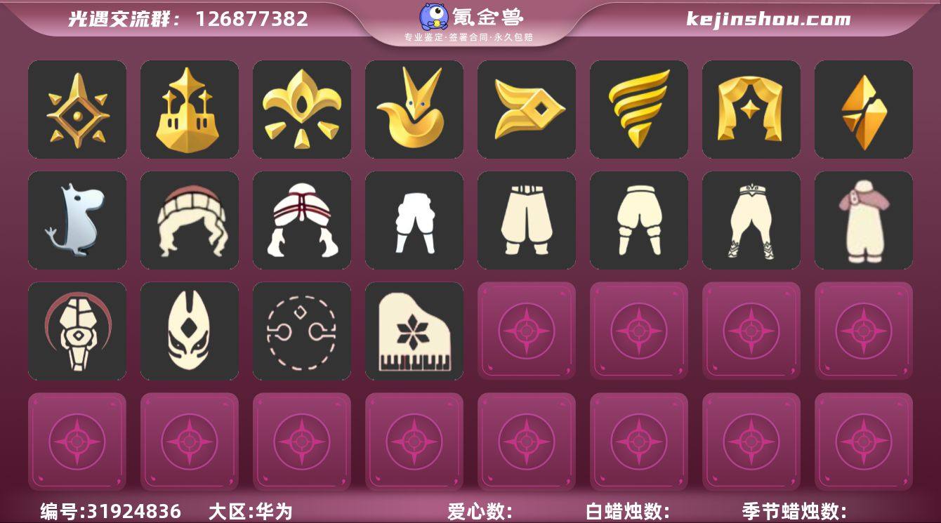 蜡烛数量:806 爱心数量:189 季节蜡烛数量:0 梦想季,集结季,小王子季,风行季,潜海季,表演季,破晓季,欧若拉季,追忆季,夜行季,九色鹿季 暮土队伍斗篷,霞谷队伍斗篷,雨林队伍斗篷,云野队伍斗篷,瑞雪斗篷,燕尾斗篷,紫金流苏斗篷,红绒斗篷,白绒斗篷,花瓣斗篷,白鸟斗,黑金,白金,红金,圣诞斗,万圣斗,海洋斗,樱花斗,紫罗兰斗 丝滑短发,中分长发,禁阁指甲盖发型,平菇发型,雨妈发型,郡主发型,古典长发,小王子发型,音乐家发型,公主头,总裁发型,长发脏辫,白枭,公主,蝴蝶结,正太,书虫,高马尾,粗辫,虚荣,花环,若笠,明制,樱花,猫耳,女巫,卫兵,圣诞帽,绒帽,虎狮,丸子盘发 风行毕业裤子,工装裤,武士裤,白棉裤,搓澡巾,灯笼裤,紧身裤,连体裤,毛靴裤,雪人裤,王子服,彩虹裤 牛头面具,凤凰面具,红狐狸,黄鼠狼,矮人面具,黑脸,牛头,兔头,玫瑰花面具 羽毛耳环,黑框眼镜,红耳机 双人沙滩躺椅,琵琶,木琴,玫瑰花,笛子,吉他,高音钢琴,排箫,火盆,烟花棒,圣诞椅,万圣椅 红色耳机,小红花,明制帽,羽毛发卡,羽毛装饰,羽毛发饰,花环-头饰,蝴蝶结-头饰,生日帽,蓝色音乐会,螃蟹南瓜 夜行季绒毛围脖,欧若拉季节项链,九色鹿季节项链,破晓季节项链,螃蟹肩饰,小王子季节项链,黑色领巾,表演季节项链,集结季节项链,风行季节项链,黑色领结,风行毛领,海螺项链,海龟项链,圣诞领结 万圣鞋 仙境茶会门扉礼包,彩虹武士裤,蛛网朋克,万圣节礼包,蝙蝠套,巫师,围巾,星球斗,小狐狸,绊爱,鹿角,蜘蛛斗,秋千,茶桌,茶壶,餐桌,白绒金,瑞雪,女巫裙,福娃,跷跷板,小船,吉他,灯笼,雪花球,绒帽,贝壳,南瓜,朋克,枯角,雪花,竖琴,电吉他,tgc,球赛门,创始人 卖家说:急出