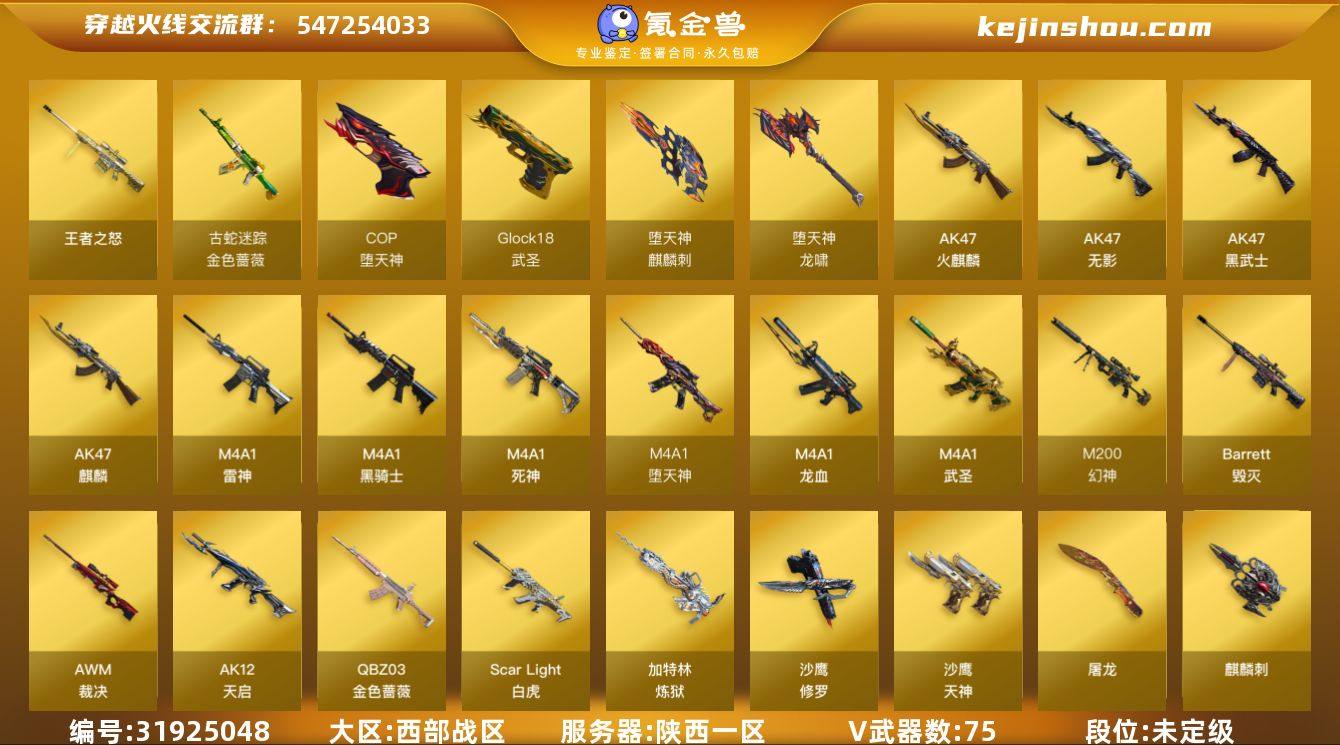 陕西一区-80V-6王者-0炫金 【热门武器】:QBZ03-金色蔷薇,Scar Light-白虎,M200-幻神,柯尔特-荣耀世冠白鲨2023,金色蔷薇-古蛇迷踪,修罗-古蛇迷踪,Kar98K-星神,M4A1-黑骑士,加特林-炼狱*2,毁灭-孙三炮,COP-白鲨,COP-堕天神,沙鹰-修罗*3 【王者炫金武器】:王者之怒*2 【音效卡】:M200-幻神音效卡,M4A1-黑骑士音效卡,死神-雪域霜狐-怀旧音效卡 【皮肤】:幻神-丹凤,幻神-CFS2022,幻神-Heartshot 皮肤,幻神-星火小队签名臻藏版 皮肤,幻神-荣耀世冠白鲨2023 皮肤,幻神-AG-CFPL S24冠军 皮肤,白虎-巅峰荣耀 皮肤,金色蔷薇-Heartshot皮肤,雷神-荣耀之魄,毁灭-百城浙江 皮肤,黑龙-能量核心,黑骑士-冠军之势,黑骑士-破界 皮肤,无影-能量核心,黑武士-典韦皮肤,战神-粉色甜心皮肤,战神-紫绶金章皮肤,战神-流金岁月皮肤*2,修罗-能量核心,屠龙-巅峰荣耀 皮肤*2 【角色】:樱,迷迭香,电竞教官-云悠悠,岚兮儿,战地猎狐,王者晴雅,雪域霜狐,蛇隐宗,北极狐-X,兰-新年限定,兰妹妹,0号玩家,零-水下丽影,灵狐者-X,灵狐者-黄金海岸,灵狐者-职业经理,龙儿,潘多拉-X,蛇姬,蜀雪,新娜塔莎,影武者-X 【人偶武器】:COP-白鲨,毁灭-孙三炮,天龙-曼陀罗,巴雷特-零-水下丽影,迷你深渊冰龙,夺魂,迷你火种,闪光弹-小乔,迷你艾比 【暴走生化】:超级对讲机 【挑战大师】:激光毁灭者III,机甲撕裂者III,试炼破坏者III,KAC-圣炎切割者III 【英雄级武器】:AK47-火麒麟,AK47-麒麟,M4A1-雷神,M4A1-黑骑士,AK47-无影,M4A1-死神,AK47-黑武士*2,AK12-天启,M4A1-武圣,M4A1-龙血,M4A1-堕天神*2,Scar Light-白虎,金色蔷薇-古蛇迷踪,死神-雪域霜狐,QBZ03-金色蔷薇,王者之心-觉醒版,AK47-B-战神,王者之鲨-觉醒版,王者火魄-觉醒版,Barrett-毁灭*2,AWM