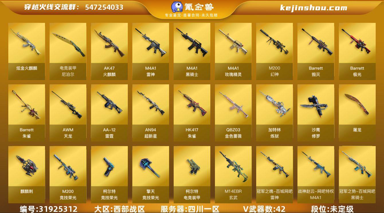 四川一区-46V-8王者-3炫金 【热门武器】:QBZ03-金色蔷薇,M14EBR-玄武,HK417-朱雀,M4A1-青龙,M200-幻神,柯尔特-荣耀世冠白鲨2023,M200-竞技荣光,柯尔特-冠军之特,Kar98K-星神,M4A1-黑骑士,加特林-炼狱,金色蔷薇-空,裁决-雪莉杨,COP-白鲨,沙鹰-修罗,Knife-冠军之刃,黄金猫猫手套-白鲨 【王者炫金武器】:炫金火麒麟,炫金骑士,炫金武士 【音效卡】:M200-幻神音效卡,AK47-火麒麟音效卡,M4A1-雷神音效卡,Barrett-毁灭音效卡,70KG语音包 【皮肤】:M200-幻神-黄忠皮肤,幻神-荣耀世冠白鲨2023 皮肤,QBZ03-冠军之薇,雷神-暗月,雷神-荣耀之魄,雷神-星空,雷神-冠军之魄,M4A1-战神赵云,雷神-宇航兔皮肤,雷神-源计划2.0专属 皮肤,火麒麟-冠军之心*2,毁灭-荣耀之怒,毁灭-冠军之怒,毁灭-战神张飞,毁灭-英雄计划 皮肤,黑骑士-暗月,黑骑士-冠军之势,黑骑士-战神马超,天龙-能量核心,AWM-天龙-传奇白鲨,修罗-冠军之魂*2 【角色】:雨棠,电竞教官-云悠悠,荒漠琉璃,妮妮,王者零-华冠丽服,乔伊教练,修道士,云海玲珑,初恋灵狐,芳心审判者,兰妹妹,灵动武士,潘多拉-X,潘多拉-甜心教官,新娜塔莎,职业选手 【人偶武器】:COP-白鲨,裁决-雪莉杨,金色蔷薇-空 【暴走生化】:超级对讲机 【挑战大师】:神圣爆裂者-末日III 【英雄级武器】:AK47-火麒麟,M4A1-雷神,M4A1-黑骑士,AN94-超新星,M4A1-青龙,HK417-朱雀,M14EBR-玄武,M4A1-玫瑰精灵,QBZ03-金色蔷薇,超新星-悦享-觉醒版,王者白虎-觉醒版,AWM-天龙,Barrett-毁灭*2,Barrett-极光,M200-幻神,Barrett-朱雀,Kar98K-星神,M200-竞技荣光,王者之决-觉醒版,王者幻神-觉醒版,王者森决-觉醒版,王者风神-觉醒版,加特林-炼狱,AA-12-雷霆*2,沙鹰-修罗,柯尔特-冠军之特,柯尔特-电竞装甲,柯尔特-