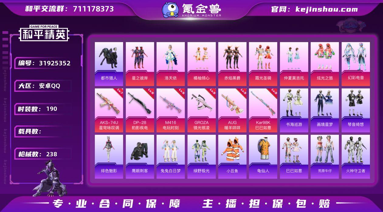 【kyhp420】安卓 手Q-8粉装-6特效枪-0载具-2粉色飞行器-68658热力值-4王牌印记-190套装-238枪皮 【热门品类】:套装-都市猎人,套装-小丑鱼,套装-龟仙人 【粉色套装】:粉装-星之彼岸,角色-洛天依,粉装-橘柚倾心,粉装-赤焰黑爵,粉装-霞光圣骑,粉装-仲夏莫吉托,粉装-炫光之旅,粉装-幻彩电音 【粉色枪皮等级】:M416-电玩时刻(五级),GROZA-镜光银凌(五级),AUG-暖羊咩咩(五级),AKS-74U-星穹咏叹调(七级),Kar98K-巳巳如意(五级),DP-28-豹影疾电(五级) 【粉色枪皮】:M416-电玩时刻,GROZA-镜光银凌,AUG-暖羊咩咩,AKS-74U-星穹咏叹调,Kar98K-巳巳如意,DP-28-豹影疾电 【粉色飞行器】:星夜魔法师飞行翼 【粉色降落伞】:幻影战神降落伞,洛神天依降落伞,天之羽翼降落伞,环太平洋降落伞,垂柳戏鸭降落伞,音爆索尼克降落伞,圣堂之誓降落伞,冠军兔兔降落伞,忍者神龟降落伞,动力核心降落伞,鬼刀降落伞,幻星舰长降落伞,异瞳寒姬降落伞,极意拳锋降落伞,炫彩糖果降落伞 【稀有套装】:套装-龟仙人,套装-巳巳如意,套装-荒原牛仔,套装-雪国风尚,套装-火种守卫者,套装-糖糖葫芦,套装-青团波波,套装-燕燕于飞,套装-鱼渊荷华,套装-迷雾之月,角色-海琴烟,套装-霓虹热舞,套装-彩虹兔,套装-云朵鹅,套装-雪绒豹,角色-夜瞳黯灵,角色-绯色魅影,套装-书海巡游,套装-画境星梦,套装-琴音绮想,套装-钻光豹影 【稀有枪皮】:AKM-墨染幽兰,AKM-彩虹符号,AKM-灼热熔岩,AKM-破晓战魂,AKM-霓虹街区,AKM-龙的传人,AKM-极光猎影,M16A4-幻世战舞者,M16A4-甜心亚梦,M16A4-红色方程式,M16A4-蓝色火焰,SCAR-L-夜灯,SCAR-L-炫彩节奏,SCAR-L-玉兔迎春,SCAR-L-红色方程式,SCAR-L-银碳小老虎,M416-糯团青竹,M416-紫翼圣骑,M416-红色方程式,M416-蓝色火焰,GROZA-异彩先驱,GROZA-彩虹符...