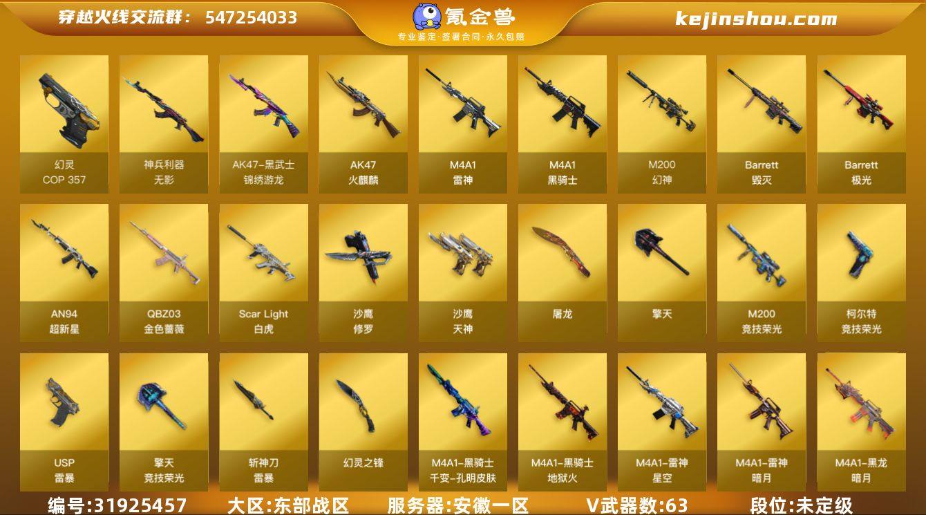安徽一区-65V-1王者-0炫金 【传说角色】:传说艾莉莎 【热门武器】:QBZ03-金色蔷薇,Scar Light-白虎,M200-幻神,M200-竞技荣光,柯尔特-冠军之特,M4A1-黑骑士,斯泰尔-蝴蝶,火麒麟-绝迹,USP-雷暴,COP 357-幻灵,沙鹰-修罗*2 【音效卡】:M200-幻神音效卡,M4A1-黑骑士音效卡,枪娘语音包-阿敏 【皮肤】:幻神-冠军之幻,幻神-青鹤,M200-幻神-荣耀世冠白鲨,白虎-AG-CFPLS20冠军,QBZ03-AG-CFPLS19冠军,金色蔷薇-枪娘阿敏 皮肤,QBZ03-荣耀世冠白鲨,雷神-暗月,雷神-荣耀之魄,雷神-星空,雷神-15周年嘉年华 皮肤,雷神-维纳斯皮肤,火麒麟-雷神,火麒麟-平天大圣,火麒麟-盘古,火麒麟-心动糖果,毁灭-风暴,毁灭-黑曼巴 皮肤,M4A1-千变-孔明皮肤,黑龙-暗月,黑骑士-地狱火,修罗-冠军之魂*2,擎天-冠军之击 【角色】:电竞教官-云悠悠,枪娘樱,王者春,乔伊教练,修道士,云海玲珑,暗夜-X,初恋灵狐,风暴女,嘉年华灵狐,荆棘玫瑰,灵狐-花神,灵狐者-X,麻雀,曼陀罗-X,曼陀罗-礼服,潘多拉-X,潘多拉-甜心教官,潜龙队-X,斯沃特-X,铁骑荣耀,维纳斯,雪莉杨-摸金校尉,樱-战斗天使 【人偶武器】:火麒麟-绝迹,斯泰尔-蝴蝶,AWM-灵狐-15周年嘉年华 【挑战大师】:神圣爆裂者III,冰龙粉碎者-白马银枪,激光毁灭者III 【英雄级武器】:AK47-火麒麟,M4A1-雷神,M4A1-黑骑士,AN94-超新星,Scar Light-白虎,无影-神兵利器,黑武士-锦绣游龙,QBZ03-金色蔷薇,王者之魄-觉醒版,Barrett-毁灭,Barrett-极光,M200-幻神,M200-竞技荣光,沙鹰-修罗*2,沙鹰-天神,USP-雷暴,COP 357-幻灵,柯尔特-冠军之特,柯尔特-竞技荣光,屠龙,擎天,幻灵之锋,擎天-竞技荣光,斩神刀-雷暴,高爆手雷-雷霆*3,高爆手雷-雷暴*3,高爆手雷-幻灵,高爆手雷-竞技荣光*2,高爆手雷-神工天巧*3,闪光弹-雷霆*4