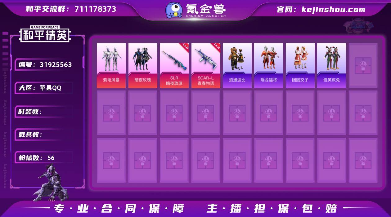 苹果Q 可二次 2粉装2特效枪48套装56枪皮 紫电风暴 暗夜玫瑰 SLR-暗夜玫瑰(4级) SCAR-L-青春物语(2级) 童趣迷兔头盔 甜心宝贝背包 萌熊伴侣背包 浪漫波比 怪笑疯兔 团圆交子 瑞龙福将 M762-瑞龙福将 和平精英账号