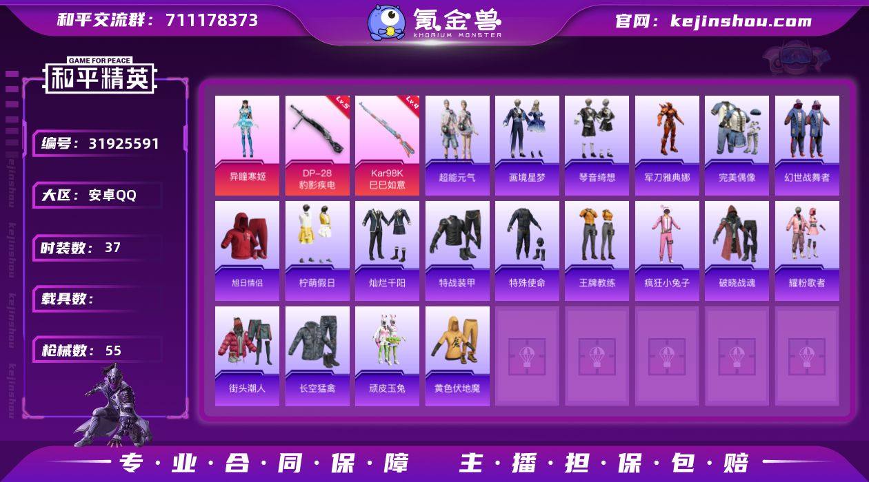无二次-安卓 手Q-1粉装-5特效枪-0载具-2粉色飞行器-13926热力值-2王牌印记-37套装-55枪皮HZ26227016 【热门品类】:角色-军刀雅典娜 【粉色套装】:角色-异瞳寒姬 【粉色枪皮等级】:ACE32-萌骑漫游(一级),AKS-74U-森灵之息(五级),Kar98K-巳巳如意(四级),Mk14-福马献瑞(三级),DP-28-豹影疾电(五级) 【粉色枪皮】:ACE32-萌骑漫游,AKS-74U-森灵之息,Kar98K-巳巳如意,Mk14-福马献瑞,DP-28-豹影疾电 【粉色飞行器】:炫彩糖果飞行器,极意拳锋飞行器 【粉色降落伞】:暗夜玫瑰降落伞,炫彩糖果降落伞,辉云木星降落伞 【稀有套装】:套装-超能元气,套装-雪国风尚,套装-炫彩糖果,套装-马上来财,套装-画境星梦,套装-琴音绮想,角色-霜纹水星 【稀有枪皮】:AUG-冰晶雪宝,AKM-星之彼岸,AKM-环太平洋,SCAR-L-夜灯,M416-糯团青竹,AUG-耀粉歌者,M762-天降萌叽,M762-第五大道,ACE32-画境星梦,UMP45-夜灯,UMP45-生命誓言,汤姆逊-天降萌叽,MP5K-画境星梦,SKS-炫彩节奏,M1加兰德-画境星梦,AA12-G-画境星梦,M249-彩虹符号,MG3-幻世战舞者,平底锅-画境星梦 【其他套装】:套装-完美偶像,套装-幻世战舞者,套装-旭日情侣,套装-柠萌假日,套装-灿烂千阳,套装-特战装甲,套装-特殊使命,套装-王牌教练,套装-疯狂小兔子,套装-破晓战魂,套装-耀粉歌者,套装-街头潮人,套装-长空猛禽,套装-顽皮玉兔,套装-黄色伏地魔 【营地ID】:950379766