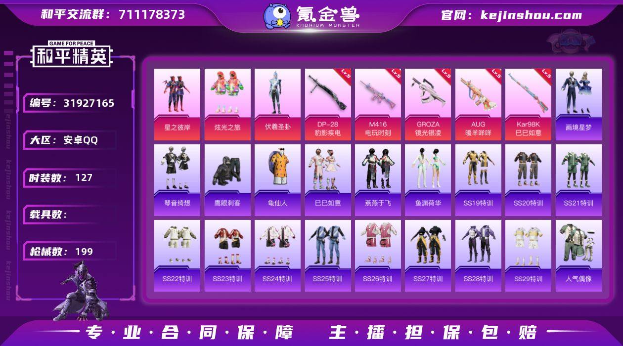 【ky239】安卓 手Q-3粉装-8特效枪-0载具-2粉色飞行器-51814热力值-18王牌印记-127套装-199枪皮 【热门品类】:套装-龟仙人 【粉色套装】:粉装-星之彼岸,粉装-炫光之旅,角色-伏羲圣卦 【粉色枪皮等级】:M416-电玩时刻(五级),GROZA-镜光银凌(五级),AUG-暖羊咩咩(五级),AKS-74U-森灵之息(五级),Kar98K-巳巳如意(五级),DP-28-豹影疾电(五级) 【粉色枪皮】:M416-电玩时刻,GROZA-镜光银凌,AUG-暖羊咩咩,AKS-74U-森灵之息,Kar98K-巳巳如意,Mk14-福马献瑞,DP-28-豹影疾电 【粉色飞行器】:炫彩糖果飞行器,星之彼岸飞行器 【粉色降落伞】:星之彼岸降落伞,洛神天依降落伞,垂柳戏鸭降落伞,精灵梦叶罗丽降落伞,鬼刀降落伞,绯穹魔姬降落伞,异瞳寒姬降落伞,炫彩糖果降落伞 【稀有套装】:套装-龟仙人,套装-巳巳如意,套装-炫彩糖果,套装-燕燕于飞,套装-鱼渊荷华,套装-画境星梦,套装-琴音绮想,套装-雨过天青,套装-红釉青花 【稀有枪皮】:AUG-冰晶雪宝,AKM-彩虹符号,AKM-恐龙拽拽,AKM-星之彼岸,AKM-破晓战魂,AKM-龙的传人,M16A4-幻世战舞者,M16A4-红色方程式,M16A4-蓝色火焰,SCAR-L-夜灯,SCAR-L-炫彩节奏,SCAR-L-玉兔迎春,SCAR-L-红色方程式,M416-糯团青竹,M416-红色方程式,M416-蓝色火焰,GROZA-彩虹符号,AUG-天降萌叽,AUG-耀粉歌者,QBZ-彩虹符号,M762-天降萌叽,M762-彩虹符号,M762-登顶巅峰,AC-VAL-天降萌叽,蜜獾-天降萌叽,蜜獾-娇憨猪猪,蜜獾-青瓷战姬,ACE32-画境星梦,UZI-啾咪啾咪,UZI-天降萌叽,UZI-娇憨猪猪,UZI-红色方程式,UMP45-夜灯,UMP45-生命誓言,UMP45-蓝色火焰,UMP45-诡娃娃,UMP45-极意拳锋,Vector-焰鹰斗篷,Vector-彩虹符号,Vector-生命誓言,Vector-金玉无双,汤姆逊-天降萌叽,汤姆逊-炫彩节奏,汤姆逊-耀粉歌者,MP5K-画境星梦,P90-飞驰...