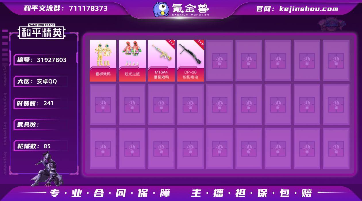 91102|【可实名】精品脱坑号 可二次 安卓QQ 2粉装(炫光之旅 垂柳戏鸭) 2粉枪( DP-28-豹影疾电) 1个7级(M16A4-垂柳戏鸭) 低价出安卓QQ 历史总热力值:24820 粉装数量:2 特效枪数量:2 历史最高段位:不朽星钻Ⅱ 套装数量:63 时装数量:241 枪械数量:85 战备数量:60 装备数量:93 时装:套装-垂柳戏鸭,套装-炫光之旅,套装-SS20特训,套装-SS21特训,套装-SS22特训,套装-SS23特训,套装-SS27特训,套装-SS32特训,套装-SS33特训,套装-云朵鹅,套装-俏皮奶喵,套装-光之冒险,套装-冷焰舞者,套装-圣穹绘梦,套装-大橘大利,套装-娇憨猪猪,套装-完美偶像,套装-幻世战舞者,套装-彩虹兔,套装-惊鸿侠骨,套装-探宝勇士,套装-明鸳圣池,套装-星影赞美诗,套装-柠萌假日,套装-海盐绵绵冰,套装-牛气冲天,套装-牛气满满,套装-特殊使命,套装-特训学院,套装-狙击之神,套装-玉兔迎春,套装-甜蜜熊情侣,套装-田园牧歌,套装-白啸长虹,套装-白糯汤圆,套装-白色伏地魔,套装-破蛋小黄鸡,套装-神气柴柴,套装-竞技名士,套装-粉团憨憨,套装-粉恋花,套装-紫幽梦,套装-绝对偶像,套装-绯格组合,套装-耀粉歌者,套装-荷畔雨呱,套装-萌趣咩咩,套装-蓝冰羽,套装-薄荷星砂,套装-街头潮人,套装-软羊咩咩,套装-轻风白浪,套装-都市魅力,套装-锦衣飞扬,套装-长空猛禽,套装-雪绒豹,套装-青涩时光,套装-顶瓜瓜,套装-飞行日记,套装-魅力单车,套装-鹤鸣,套装-麻辣教官,角色-玫纹锢梦 枪械:M16A4-垂柳戏鸭(7级),AC-VAL-乌木金纹,AC-VAL-天降萌叽,AC-VAL-闲梦青缨,AKM-龙的传人,AUG-异域银装,AUG-耀粉歌者,G36C-懵萌河马,GROZA-懵萌河马,GROZA-田园牧歌,M416-糯团青竹,M762-云朵鹅,M762-天降萌叽,M762-甜心宝贝,M762-萌物绒绒,Mk47-乌木金纹,QBZ-未来歌姬,QBZ-魔药课室,SCAR-L-炫彩节奏,SCAR-L-玉兔迎春,蜜獾-垂柳戏鸭,蜜獾-天降萌叽,蜜獾-娇憨猪猪,AWM-垂柳戏鸭,M200-惊鸿...