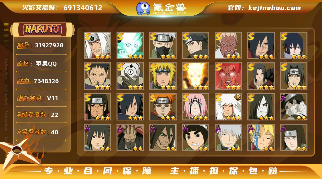 IOS/22S忍/40A忍/战力734W/V11/区服532 【S忍者】 宇智波佐助「漩涡鸣人」,宇智波止水「须佐能乎」,艾「忍界大战」,宇智波斑「秽土转生·解」,宇智波佐助「永恒万花筒」,春野樱「忍界大战」,漩涡鸣人「九喇嘛连结」,迈特凯「死门」,宇智波斑「木叶创立」,宇智波带土「忍界大战」,千手柱间「秽土转生」,自来也「舞之豪杰」,旗木卡卡西「须佐能乎」,大筒木舍人「最终章」,自来也「传说中的三忍」,宇智波鼬「秽土转生」,宇智波斑「白面具」,宇智波鼬「须佐能乎」,佩恩「天道」,波风水门,大蛇丸,波风水门「九喇嘛连结」, 【A忍者】 大野木「侠隐江湖」,巳月「仙人模式」,迈特凯「青春爆炸」,长十郎「六代目水影」,日向宁次「忍界大战」,漩涡博人「桃式显现」,旗木卡卡西「幻之真容」,李洛克「忍界大战」,蝎「绯流琥」,宇智波泉奈,桃地再不斩「秽土转生」,角都「秽土转生」,宇智波止水,长门「青年」,佩恩·六道「漂泊浪客」,艾「青年」,达鲁伊「五代目雷影」,波风水门「青年」,千手扉间「漂泊武士」,奇拉比「忍界大战」,宇智波止水「新春限定」,飞段「恶灵之影」,宇智波佐助「须佐能乎」,迪达拉「秽土转生」,小南「新春限定」,千代「近松十人卫」,秋道丁次「忍界大战」,照美冥「五代目水影」,宇智波佐助「万花筒写轮眼」,奇拉比,飞段「死司凭血」,飞段,迪达拉,我爱罗「疾风传」,蝎,干柿鬼鲛,宇智波鼬,猿飞阿斯玛,迈特凯, PX_2479906