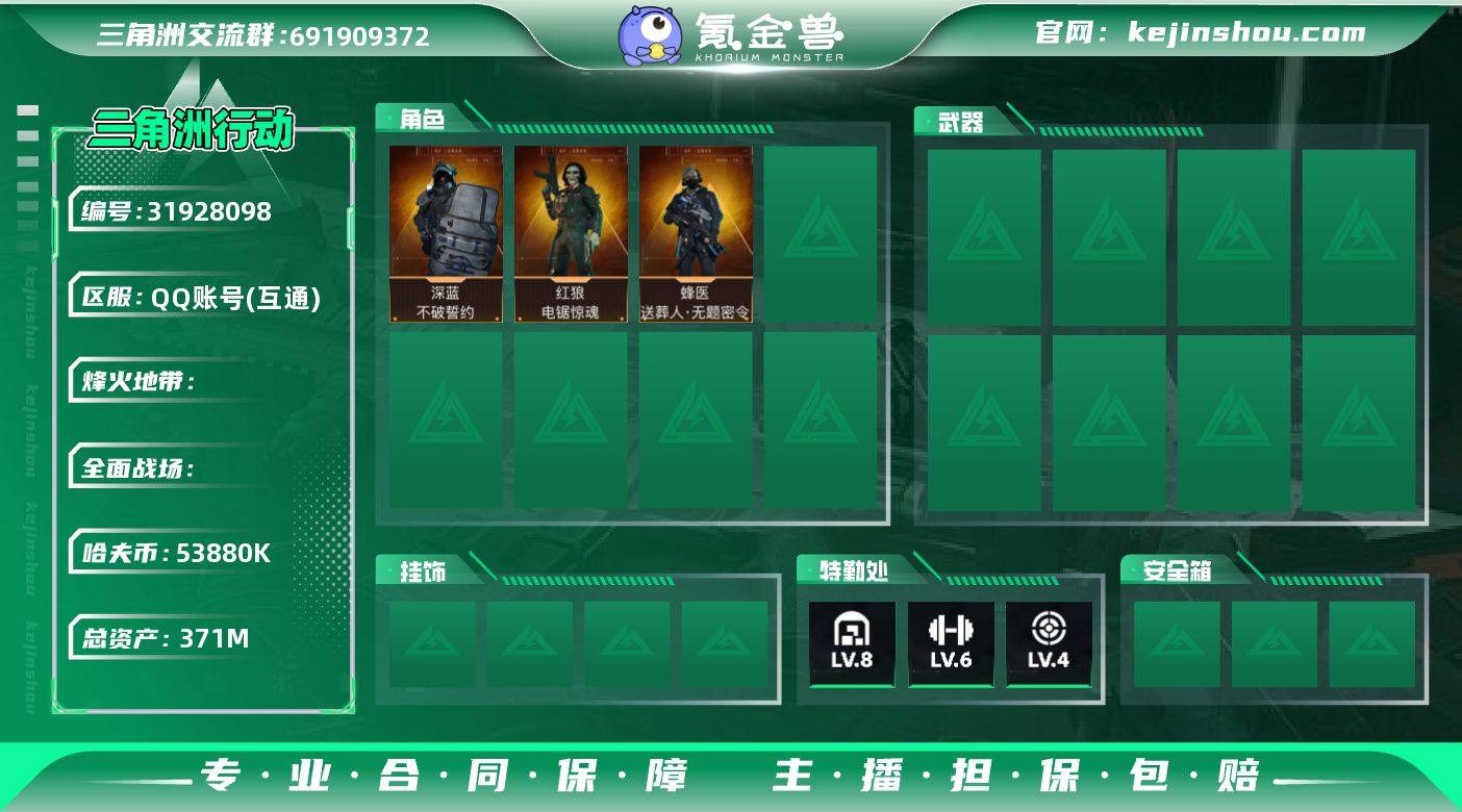 S1281 总资产371M,哈夫币5388w,近战1 枪皮数量167,红狼-电锯惊魂/深蓝-不破誓约/蜂医-送葬人无题密令,战场等级13上等兵, 行动等级60青铜,安全箱等时效性道具请以游戏内数据为准,详情请看图