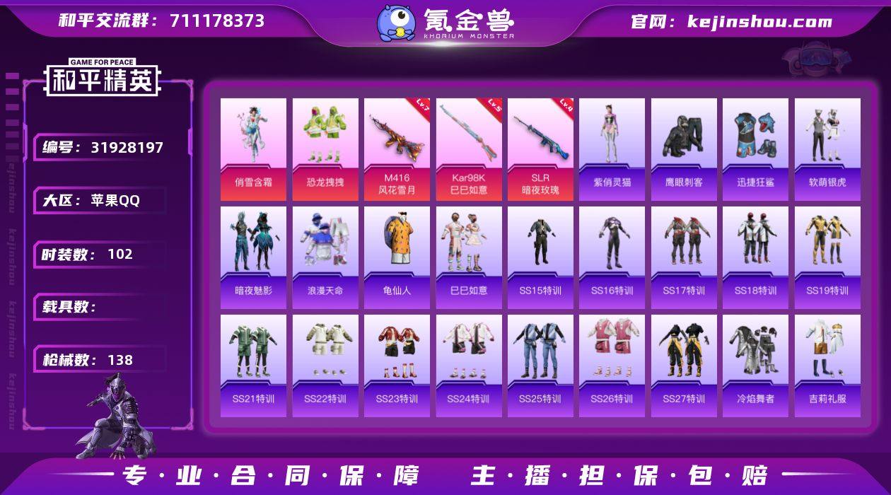 无二次-苹果 手Q-2粉装-4特效枪-0载具-0粉色飞行器-41017热力值-4王牌印记-102套装-138枪皮HZ262249 【热门品类】:套装-浪漫天命,套装-龟仙人 【粉色套装】:粉装-俏雪含霜,粉装-恐龙拽拽 【粉色枪皮等级】:M416-风花雪月(七级),Kar98K-巳巳如意(五级),Mk14-福马献瑞(五级),SLR-暗夜玫瑰(四级) 【粉色枪皮】:M416-风花雪月,Kar98K-巳巳如意,Mk14-福马献瑞,SLR-暗夜玫瑰 【粉色降落伞】:烈焰拳霸降落伞,暗夜玫瑰降落伞,蓝莓炮弹降落伞,焦糖拿铁降落伞,碧影闪光降落伞,恐龙拽拽降落伞,橘柚倾心降落伞,暗夜鎏金降落伞,炫彩糖果降落伞 【稀有套装】:套装-龟仙人,套装-巳巳如意,套装-雪国风尚,角色-紫俏灵猫 【稀有枪皮】:AKM-彩虹符号,AKM-恐龙拽拽,AKM-海渊国主,AKM-生命誓言,AKM-破晓战魂,AKM-缤纷海域,AKM-萌趣颜团子,AKM-虎虎生威,M16A4-夜灯,M16A4-幻世战舞者,M16A4-蓝色火焰,SCAR-L-暗夜玫瑰,SCAR-L-炫彩节奏,SCAR-L-红色方程式,SCAR-L-黄金龙骨,M416-动感兔斯基,M416-夜灯,M416-糯团青竹,M416-蓝色火焰,GROZA-异彩先驱,GROZA-彩虹符号,GROZA-影袭,GROZA-恐龙拽拽,GROZA-懵萌河马,GROZA-田园牧歌,AUG-青春冒险家,QBZ-彩虹符号,QBZ-神秘黑猫,M762-天降萌叽,M762-瑞龙福将,Mk47-妙红点点,Mk47-青春冒险家,G36C-懵萌河马,G36C-暗夜玫瑰,AC-VAL-天降萌叽,蜜獾-千面幻镜,蜜獾-天降萌叽,蜜獾-娇憨猪猪,UZI-天降萌叽,UZI-娇憨猪猪,UZI-影袭,UZI-炫彩节奏,UMP45-涂山之恋,UMP45-蓝色火焰,Vector-田园牧歌,汤姆逊-天降萌叽,汤姆逊-异彩先驱,汤姆逊-炫彩节奏,野牛-夜灯,野牛-青春冒险家,MP5K-异彩先驱,MP5K-蓝莓炮弹,AKS-74U-鬼刀,P90-巳巳如意,Kar98K-影袭,Kar98K-梦幻火箭,Kar98K-灵符少年,Kar98K-飞驰魅影,M24-影袭,AWM-恐龙拽拽...
