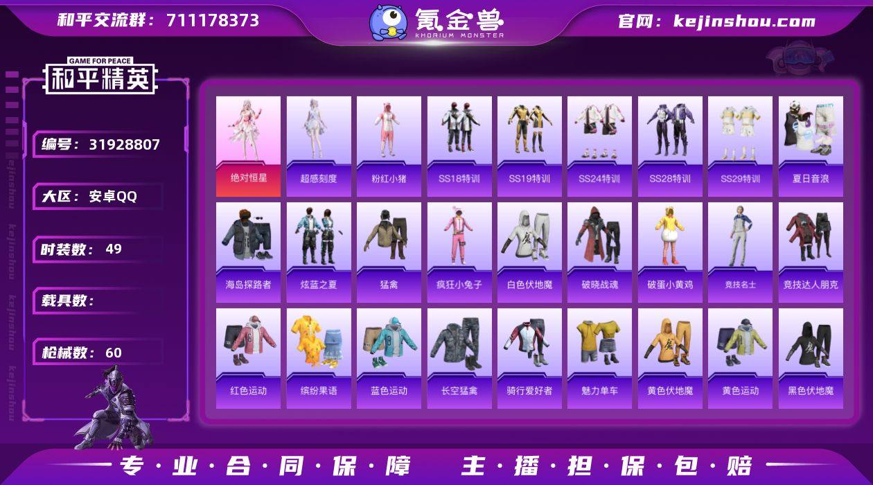 无二次-安卓 手Q-1粉装-1特效枪-0载具-1粉色飞行器-14784热力值-7王牌印记-49套装-60枪皮HZ2622804 【热门品类】:套装-粉红小猪 【粉色套装】:角色-绝对恒星 【粉色枪皮等级】:Mk14-福马献瑞(五级) 【粉色枪皮】:Mk14-福马献瑞 【粉色飞行器】:炫彩糖果飞行器 【粉色降落伞】:异瞳寒姬降落伞,极意拳锋降落伞,炫彩糖果降落伞 【稀有套装】:角色-超感刻度,套装-雪国风尚,套装-炫彩糖果,套装-马上有钱 【稀有枪皮】:AUG-冰晶雪宝,AKM-彩虹符号,AKM-破晓战魂,AKM-霓虹街区,AKM-龙的传人,SCAR-L-炫彩节奏,SCAR-L-红色方程式,M416-红色方程式,M416-蓝色火焰,AUG-耀粉歌者,AUG-绝对恒星,QBZ-彩虹符号,M762-天降萌叽,AC-VAL-天降萌叽,UZI-啾咪啾咪,UMP45-涂山之恋,UMP45-生命誓言,UMP45-极意拳锋,Vector-生命誓言,汤姆逊-耀粉歌者,Kar98K-彩虹符号,Kar98K-影袭,Kar98K-炫彩节奏,M24-影袭,VSS-虎痴许褚,Mini14-耀粉歌者,S686-彩虹符号,S686-生命誓言,M249-彩虹符号,MG3-幻世战舞者,突击盾牌-绝对恒星 【其他套装】:套装-SS18特训,套装-SS19特训,套装-SS24特训,套装-SS28特训,套装-SS29特训,套装-夏日音浪,套装-海岛探路者,套装-炫蓝之夏,套装-猛禽,套装-疯狂小兔子,套装-白色伏地魔,套装-破晓战魂,套装-破蛋小黄鸡,套装-竞技名士,套装-竞技达人朋克,套装-粉红小猪,套装-红色运动,套装-缤纷果语,套装-蓝色运动,套装-长空猛禽,套装-骑行爱好者,套装-魅力单车,套装-黄色伏地魔,套装-黄色运动,套装-黑色伏地魔,套装-漫步者 【营地ID】:797466324