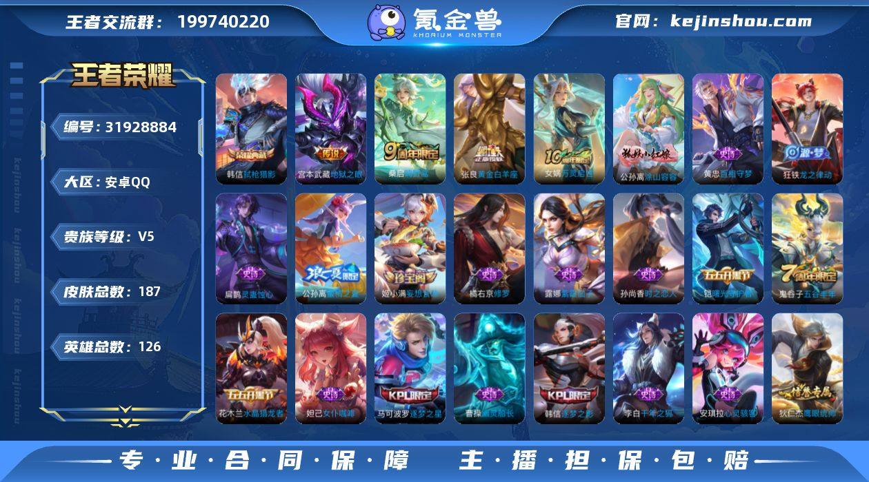 安卓Q-V5-最强王者段位-126英雄-187皮肤-1典藏皮肤-3传说-53史诗 【荣耀典藏】:韩信弑枪猎影 【传说皮肤】:桑启鸣野蒿,张良黄金白羊座,宫本武藏地狱之眼 【限定皮肤】:白起狰,狄仁杰阴阳师,赵云皇家上将,庄周高山流水,高渐离死亡摇滚,芈月重明,夏侯惇朔风刀,甄姬游园惊梦,曹操烛龙,典韦穷奇,马可波罗逐梦之星,狄仁杰魔术师,狄仁杰万华元夜,达摩沙漠行僧,项羽海滩派对,老夫子醍醐杖,程咬金演武夺筹,韩信逐梦之影,兰陵王金庭之子,牛魔御旌,李元芳云中旅人,钟馗驱傩正仪,杨玉环遇见飞天,太乙真人饕餮,鬼谷子原初探秘者,鬼谷子五谷丰年,苏烈千军破阵,百里玄策原初追逐者,弈星混沌棋,公孙离蜜橘之夏,沈梦溪大漠名商,明世隐疑决卦,裴擒虎擒涛扼浪,狂铁御狮,米莱狄御霄,盾山御銮,上官婉儿梁祝,鲁班大师探海日志,桑启海盐诗旅,张良古海寻踪,鬼谷子天穹祈灯,姬小满妄想食味,刘邦剑破天穹 【赛季限定】:白起狰,太乙真人饕餮,曹操烛龙,芈月重明,典韦穷奇,狂铁御狮,米莱狄御霄,牛魔御旌,盾山御銮,夏侯惇朔风刀,弈星混沌棋,明世隐疑决卦,老夫子醍醐杖,鬼谷子原初探秘者,狄仁杰万华元夜,程咬金演武夺筹,钟馗驱傩正仪,苏烈千军破阵,达摩沙漠行僧,兰陵王金庭之子,沈梦溪大漠名商,李元芳云中旅人,桑启海盐诗旅,裴擒虎擒涛扼浪,鲁班大师探海日志,张良古海寻踪,鬼谷子天穹祈灯,刘邦剑破天穹,东皇太一噬灭天穹,太乙真人谧流熔炉,甄姬逆浪荇歌,亚瑟荣光之誓,百里玄策原初追逐者,牛魔星界战将 【史诗皮肤】:女娲万灵启世,公孙离涂山容容,黄忠百相守梦,扁鹊灵蛊蚀心,狂铁龙之律动,牛魔星界战将,姬小满妄想食味,鬼谷子五谷丰年,哪吒雪上飞焰,庄周高山流水,沈梦溪月团寄思,百里玄策原初追逐者,孙尚香时之恋人,橘右京修罗,上官婉儿梁祝,...