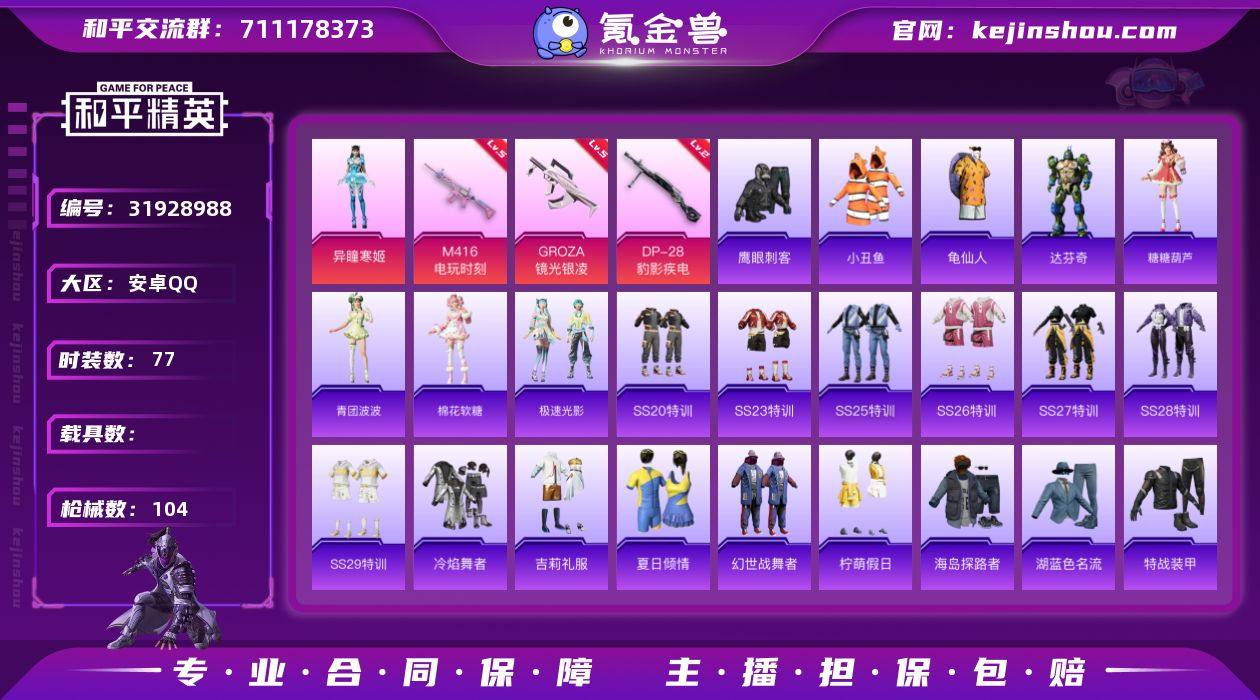 【ky287】安卓 手Q-1粉装-4特效枪-0载具-1粉色飞行器-29367热力值-2王牌印记-77套装-104枪皮 【热门品类】:套装-小丑鱼,套装-龟仙人 【粉色套装】:角色-异瞳寒姬 【粉色枪皮等级】:M416-电玩时刻(五级),GROZA-镜光银凌(五级),DP-28-豹影疾电(二级) 【粉色枪皮】:M416-电玩时刻,GROZA-镜光银凌,Mk14-福马献瑞,DP-28-豹影疾电 【粉色飞行器】:炫彩糖果飞行器 【粉色降落伞】:极限特训降落伞,音爆索尼克降落伞,精灵梦叶罗丽降落伞,千金淑猫降落伞,炫彩糖果降落伞 【稀有套装】:套装-龟仙人,套装-雪国风尚,套装-炫彩糖果,角色-达芬奇,套装-糖糖葫芦,套装-青团波波,套装-棉花软糖,套装-极速光影 【稀有枪皮】:AKM-彩虹符号,AKM-影袭,AKM-江南烟雨,AKM-龙的传人,M16A4-甜心亚梦,SCAR-L-炫彩节奏,M416-糯团青竹,M416-红色方程式,M416-蓝色火焰,GROZA-影袭,AUG-天降萌叽,AUG-耀粉歌者,M762-天降萌叽,AC-VAL-天降萌叽,AC-VAL-甜心亚梦,蜜獾-天降萌叽,UZI-啾咪啾咪,UZI-影袭,UMP45-蓝色火焰,UMP45-绒宝小鹅,Vector-焰鹰斗篷,汤姆逊-天降萌叽,汤姆逊-奇异狩猎者,汤姆逊-环太平洋,汤姆逊-耀粉歌者,M24-影袭,AWM-焰鹰斗篷,SKS-炫彩节奏,Mini14-炫彩节奏,M417-惊鸿侠骨,M200-惊鸿侠骨,S686-红色方程式,S12K-玩趣呆呆,S12K-幻世战舞者,DBS-焰鹰斗篷,DBS-甜心亚梦,M249-彩虹符号,M249-糯团青竹,DP-28-焰鹰斗篷,DP-28-甜心亚梦,MG3-幻世战舞者,MG3-惊鸿侠骨,短管霰弹-星穹咏叹调,爆炸猎弓-惊鸿侠骨 【其他套装】:套装-SS20特训,套装-SS23特训,套装-SS25特训,套装-SS26特训,套装-SS27特训,套装-SS28特训,套装-SS29特训,套装-冷焰舞者,套装-吉莉礼服,套装-夏日倾情,套装-幻世战舞者,套装-柠萌假日,套装-海岛探路者,套装-湖蓝色名流,套装-特战装...