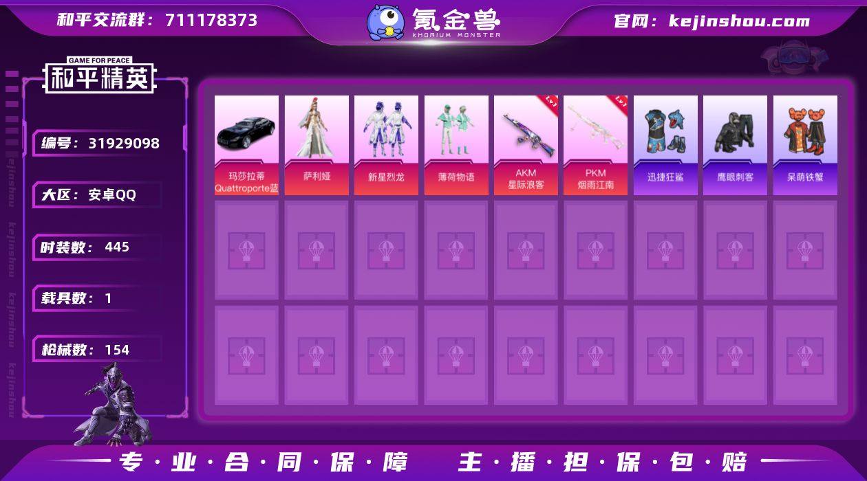 4粉装 6特效枪 1载具 7印记 可二次 【热门装扮】萨利娅,辉云木星,新星烈龙(小白龙),薄荷物语,迅捷狂鲨,鹰眼刺客,呆萌铁蟹 【载具】玛莎拉蒂Quattroporte(夜幕蓝) 【稀有枪皮】Kar98K-巳巳如意,UMP45-萌骑冒险,14-福马献瑞,DP-28-豹影疾电,AKM星际浪客,PKM江南烟雨 【七级特效枪】七级AKM-星际浪客,七级PKM-江南烟雨 【五级特效枪】五级Kar98K-巳巳如意,五级14-福马献瑞,五级DP-28-豹影疾电 【紫色装扮】马上有钱,凌霄紫焰,SS34特训套装,朱霞炽焰,幻世战舞者,夏日音浪,幻影武者,战地督导,探宝勇士,冰川特警,冷焰舞者,刚毅裁决者,北国孤狼,格斗先锋,炫蓝之夏,牛气冲天,灰色格斗者,猛禽,甜蜜告白,甜蜜熊情侣,疯狂小兔子,柠萌假日,沙漠毒蛇,海岛探路者,深蓝色名流,潮流炫酷,甜心亚梦,虚音幻奏,SS20特训,娇憨猪猪,萌趣咩咩,SS21特训,异彩先驱,SS18特训,浓情蜜辣,飞驰魅影,音速流光,极速竞梦,SS19特训,军刀雅典娜,青涩时光,SS31特训套装,云朵鹅,雪绒豹,轻风白浪,田园牧歌,SS23特训,SS22特训,飞狐塔尔斯,妙红点点,幻彩翩翩,SS36特训,SS35特训,紫俏灵猫,瑰石海星,福马献瑞,狙击之神,雨过天青,破晓战魂,虎虎生威吉莉,跃动心情,长空猛禽,荣耀,破蛋小黄鸡,福星高照,空投萌叽,竞技勇士朋克,绮丽涂鸦,薄荷星砂,无面战甲,夜瞳黯灵,香桃花海,雪山精英,魅力单车,霓虹极客,霓虹街区,青年教官,飞行日记,鹤鸣,麻辣教官,龙的传人,SS17特训,糖糖葫芦,先驱飞行员,青团波波,竞技名士,Mark.06(新蓝螳螂),玉兔迎春,巳巳如意,智谋强哥,小丑鱼,情公主,纯真浪花,热情海星,SS28特训,SS16特训,电音精灵,瑞龙福将,团圆交子,传奇侦探,SS32特训套装,绯格组合,SS6特训,漫步者,冰冻风暴,弄潮海豚,冷血极客 【优质战备】创世·救赎降落伞,绮梦流光降落伞,辉云木星降落伞,绯穹魔姬降落伞,荧海星豚降落伞,环太平洋降落伞,垂柳戏鸭降落伞,橘柚倾心降落伞