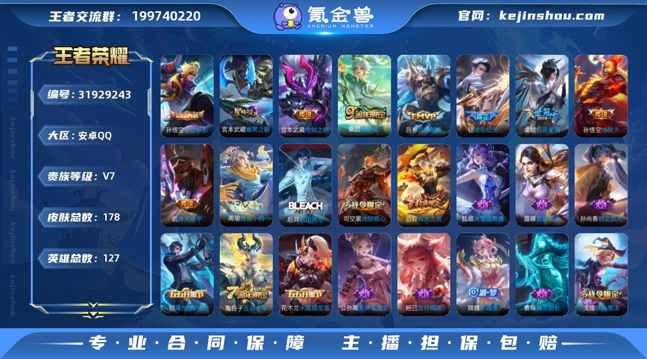 贵族6/皮肤122/传说9/史诗30/英雄118/孙权全皮/愿照·山河定/愿照·九州拓/祥瑞亨通/鸣野蒿/澜逐花归海/诗剑行/无双飞将/绛天战甲/黄金狮子座/虞姬夏日便利店/阴阳师/皇家上将/云间偶戏/魔术师/海滩派对/擒涛扼浪(s31)/探海日志(s32)/海盐诗旅(s30)/流音漫舞/鬼谷子天穹祈灯(S34)/妄想食味/龙武盛年/噬灭天穹(s37)/虚灵犬护/逆浪荇歌/荣光之誓/鸭鸭历险记-刘禅/鸭鸭历险记-沈梦溪/百相守梦-周瑜/百相守梦-孙策/光弋星穹/往忆晖光/线条小狗-周瑜/紫霞仙子/圣诞恋歌/偶像歌手/鬼剑武藏/水果甜心/魅力维加斯/暗隐猎兽者/黄金分割率/心灵战警/特工魅影/天才门将/功夫厨神/箭羽风息/鹰眼统帅/晚萤/魅语/修罗/天秀·启明/龙之律动/石田雨龙/百相守梦-黄忠/万灵启世/巫礼祀神/教廷特使/爱心护理/白执事/忍·炎影/红桃皇后/白色死神/未来纪元-宫本武藏/黄金武士/死亡骑士/拳王/兔女郎/花好人间/万象初新/龙腾万里/功夫老勺/掌控之力/敏锐之力/幻乐之宴/野性能量/鲨炮海盗猫/完美运算/朵莉亚金色潮汐/暗都幽影/布丁狗之约/命运加冕/死霸装/踏浪烽翎/克喵/径山谋武/鹤鸣心笺/溯影追猎/金属狂潮/绯红之刃/生化警戒/异域舞娘/剑舞者/精灵公主/锦衣卫/超能战警/未来旅行/西部大镖客-孙悟空/隐刃/范海辛/特种部队/激情绿茵/埃及法老/芝加哥教父/第七人偶/龙域领主/绝影神枪/占星师/魇语军师/灼热之刃/修竹墨客/露花倒影/创世神祝/森/幸存者/归虚梦演-鲁班大师/归虚梦演-蒙犽/秩序猎龙将/熊喵少女/孤猎/启蛰/前尘/碧珀绯影