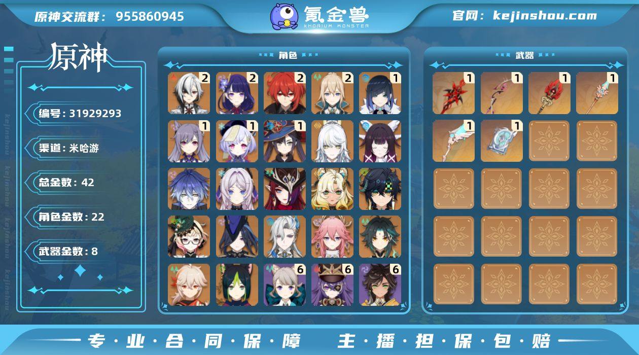 邮箱: 不送邮/死邮 总黄数: 42 冒险等级: 59 2命金色角色: 二命迪卢克,二命琴,二命雷电将军,二命阿蕾奇诺 1命金色角色: 一命七七,一命刻晴,一命莫娜,一命夜兰 0命金色角色: 枫原万叶,魈,八重神子,提纳里,那维莱特,克洛琳德,艾梅莉埃,基尼奇,希诺宁,恰斯卡,茜特菈莉,菲林斯,哥伦比娅,兹白 拥有武器: 天空之翼,四风原典,天空之脊,护摩之杖,最初的大魔术,赤月之形 1精武器: 天空之翼,四风原典,天空之脊,护摩之杖,最初的大魔术,赤月之形 亮点: tao已注销