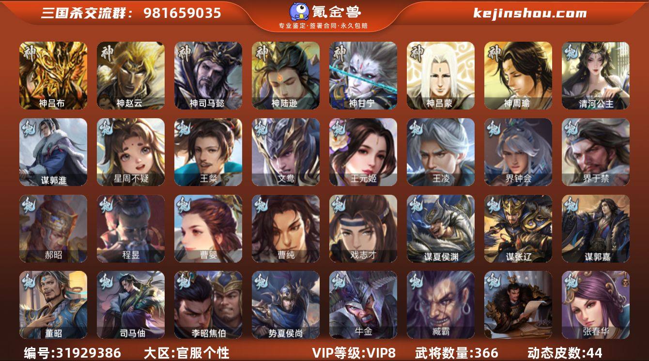官阶:大将军;VIP等级:VIP8;史诗武将数量:49;动态皮肤数量:44;武将总数:366;史诗宝珠数量:0;将魂数量:0;神将:5;魏国史诗武将:20;蜀国史诗武将:9;吴国史诗武将:9;群史诗武将:15