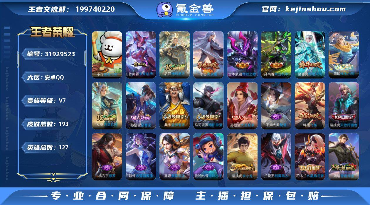 贵族等级:V7 典藏皮肤数:0 珍品无双皮肤数:0 无双皮肤数:0 珍品传说皮肤数:0 传说皮肤数:5 史诗皮肤数:50 皮肤数:193 英雄数:127 段位:王者 卖家说:随便看看,喜欢的兄弟可以议价