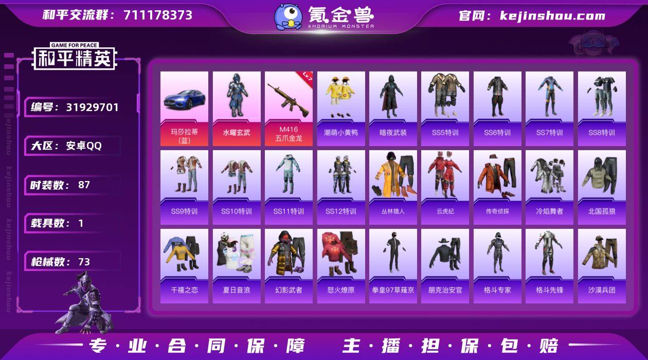 无二次-安卓 手Q-1粉装-2特效枪-1载具-0粉色飞行器-26528热力值-2王牌印记-87套装-73枪皮HZ262266 【热门品类】:套装-潮萌小黄鸭 【粉色套装】:粉装-水曜玄武 【粉色枪皮等级】:M416-五爪金龙(七级),Mk14-福马献瑞(一级) 【粉色载具】:玛莎拉蒂Ghibli(蓝) 【粉色枪皮】:M416-五爪金龙,Mk14-福马献瑞 【粉色降落伞】:甜心宝贝降落伞 【稀有套装】:套装-马上有钱 【稀有枪皮】:AKM-生命誓言,AKM-锦绣火鲤,AKM-霓虹街区,AKM-龙的传人,M16A4-快乐主宰,SCAR-L-炫彩节奏,SCAR-L-红色方程式,GROZA-暗夜武装,GROZA-生命誓言,GROZA-黑色刀锋,AUG-凝视深渊,QBZ-银河战甲,M762-拳皇97,M762-甜心宝贝,UZI-天降萌叽,UZI-红色方程式,UMP45-夜灯,UMP45-狮舞迎春,UMP45-生命誓言,Vector-黑色刀锋,汤姆逊-勇闯险境,汤姆逊-奇异狩猎者,Kar98K-勇闯险境,Kar98K-狮舞迎春,M24-冰封烈焰,M24-奇异狩猎者,AWM-荒野猎神,SKS-勇闯险境,SKS-夜灯,VSS-黑色刀锋,Mini14-时之沙漏,Mini14-耀粉歌者,Mini14-金鼠迎春,S686-冰封烈焰,S1897-勇闯险境,S1897-春暖花开,M249-拳皇97,M249-破晓战魂,MG3-幻世战舞者,P92-拳皇97,P1911-冰封烈焰 【其他套装】:套装-SS5特训,套装-SS6特训,套装-SS7特训,套装-SS8特训,套装-SS9特训,套装-SS10特训,套装-SS11特训,套装-SS12特训,套装-丛林猎人,套装-云虎纪,套装-传奇侦探,套装-冷焰舞者,套装-北国孤狼,套装-千禧之恋,套装-夏日音浪,套装-幻影武者,套装-怒火燎原,套装-拳皇97草薙京,套装-朋克治安官,套装-格斗专家,套装-格斗先锋,套装-沙漠兵团,套装-沙漠探路者,套装-潮流先锋,套装-火狐专家,套装-灰色守护者,套装-炽焰拳师,套装-燃烧卡路里,套装-牛气冲天,套装-特战装甲,套装-特殊使命,套装-特训学院,套装-甜蜜告白,套...