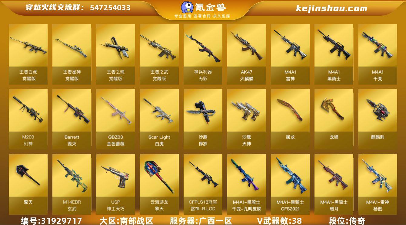 广西一区-45V-4王者武器数-0炫金武器数 【热门武器】:QBZ03-金色蔷薇,M14EBR-玄武,Scar Light-白虎,M200-幻神,M4A1-黑骑士,沙鹰-修罗*2 【音效卡】:M4A1-雷神音效卡,M4A1-黑龙音效卡,M4A1-黑骑士音效卡,Barrett-毁灭音效卡,QBZ03-金色蔷薇音效卡,Scar Light-白虎音效卡 【皮肤】:幻神-CFS2022,雷神-荣耀之魄,M4A1-雷神-CFS 2019,雷神-耀金皮肤,雷神-冠军之魄,雷神-宠儿-2019MVP,雷神-杨戬,雷神-R.LGD-CFPLS18冠军,火麒麟-平天大圣,火麒麟-盘古,火麒麟-斗鱼平台皮肤,火麒麟-百城,火麒麟-心动糖果,毁灭-荣耀之怒,毁灭-BEAN-2020MVP,毁灭-黑大圣皮肤,毁灭-风暴,M4A1-千变-孔明皮肤,黑骑士-暗月*2,黑骑士-CFS2021,无影-暗月,AK47-B-常胜将军-曹操,AK47-B-常胜将军-孙权,屠龙-春桃 皮肤,龙啸-冠军之啸,擎天-秘银,擎天-冠军之击 【角色】:魅影,鹰,王者-葵-貂蝉,王者玲珑,云海玲珑,芳心审判者,风暴女,嘉年华灵狐,龙儿,龙儿-小淘气,潘多拉-X,斯沃特-X,甜心偶像,职业选手 【人偶武器】:天龙-曼陀罗,AWM-灵狐-15周年嘉年华,迷你牛魔王,迷你牛牛,迷你超能女侍 【暴走生化】:超级对讲机 【挑战大师】:冰龙粉碎者-白马银枪,激光毁灭者III-白马银枪 【英雄级武器】:M4A1-千变,AK47-火麒麟*2,M4A1-雷神,M4A1-黑骑士,Scar Light-白虎,M14EBR-玄武,无影-神兵利器,QBZ03-金色蔷薇,王者之武-觉醒版,王者白虎-觉醒版,Barrett-毁灭,M200-幻神,王者星神-觉醒版,沙鹰-修罗*2,沙鹰-天神,USP-神工天巧,王者之魂-觉醒版,屠龙*2,龙啸,擎天,麒麟刺,擎天-云海游龙,高爆手雷-幻灵*2,高爆手雷-竞技荣光,高爆手雷-神工天巧*4,手雷-云海游龙,闪光弹-神工天巧*4,烟雾弹-竞技荣光,烟雾弹-神工天巧*2 【道具】:CFS限定背包,亚洲杯纪念炫彩背包,虎牙炫彩...