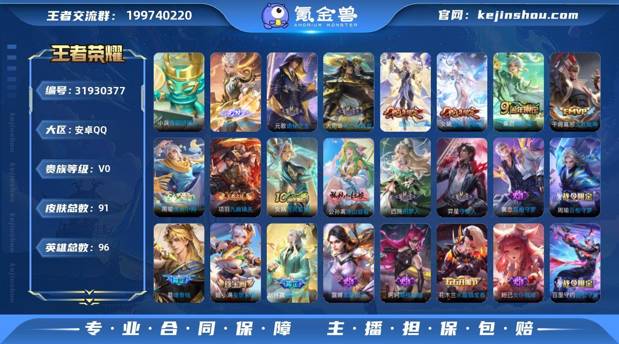 贵族等级:V0 典藏皮肤数:0 珍品无双皮肤数:0 无双皮肤数:1 珍品传说皮肤数:0 传说皮肤数:6 史诗皮肤数:27 皮肤数:91 英雄数:96 段位:绝世王者 卖家说:诡秘之主系列有按键,耀无双按键,水晶抽了200多快出了