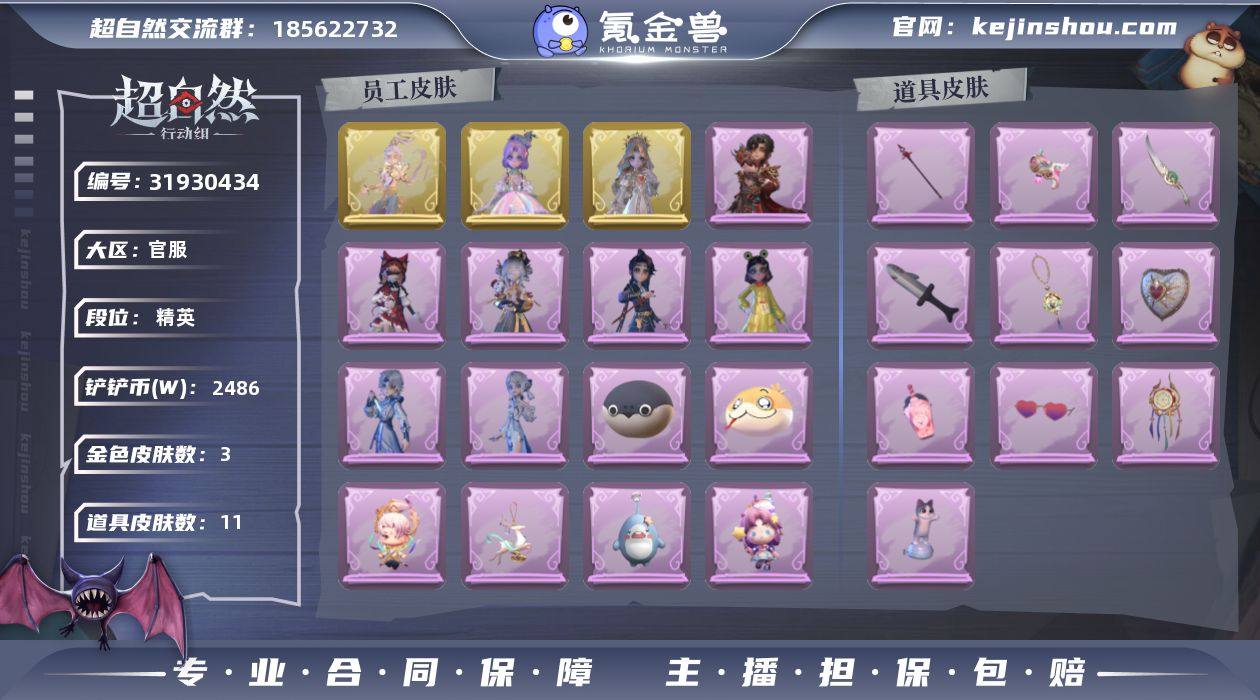 【Q1428】 【段位】超自然传说 【幻梦皮肤数量】0 【星耀限定皮肤数量】0 【金色皮肤数量】4 【紫色皮肤数量】14 【道具皮肤数量】42 【铲铲币】4001w 【累充】31560金砖 【赛季魔盒】普通魔盒 【员工】小黄、爱丽丝、零、阿念、逍遥、薇薇安、巫铃儿、莉莉、艾伦、爱德华、兰、小满、临云 【金色皮肤】逍遥-莲华渡、薇薇安-圣光之谕、小黄-遗失的童话、巫铃儿-镜花辞 【紫色皮肤】阿念-庆宴绮愿、爱丽丝-耀眼的你、薇薇安-仙锋小姐、爱丽丝-甜梦派对、莉莉-莓果陷阱、小黄-异色序曲、莉莉-除妖小师妹、莉莉-情公主、爱丽丝-冰公主、薇薇安-白光莹、阿念-灵昭鹿鸣、巫铃儿-素影瑶光、爱丽丝-丝缕哀歌、逍遥-绣春逍影 【道具皮肤】传送按钮-昆仑镜、摸金符-紫霄、铲子-龙鳞、额外的背包-飞花令、刺刀-赤色之刃、铲子-赞萌波板糖、急救包-蔷薇物语、桃木剑-最后的独角兽、腰包-月下莲台、长鞭-飞天绫、黄牛能量饮料-青玉抱丹、音响-happy猫、长鞭-小狗蛇点点鞭、黄牛能量饮料-珍珠芭乐莓莓、专业手电-云端梦想计划、电击枪-甜蜜泡泡枪、急救包-末章心跳、铲子-圣心之泪、腰包-宝剑八、刺刀-小鲨匕首、传送按钮-幻宠之门、长枪-糖葫芦霸王枪、铲子-卡皮巴拉小黄豚铲、音响-鸣沙鼓、夜视仪-金丝眼镜、摸金符-花落精绝、腰包-惊魂娃娃、转轮手枪-新星时代、短管猎枪-赞萌露比水枪、摸金符-祝祷词、喷气背包-乘风溯雪、闪光弹-金戈玄铜、刺刀-碧络琅环、背饰-蜜蜂线索、背饰-潮汐小海兔、背饰-兔先生的时钟、背饰-云梦之星、背饰-天使的呼唤、背饰-蝶恋花 【载具】惊奇万圣涂装 【头饰】烛光纪念、太空鲨头套、雪墩墩头套、蒜了八、樱桃奶油布丁、惊魂南瓜头套、精致露比头套、鱼头怪头套、烈焰红唇头套、大葱明头套、火爆了头套、面具马头套、哈士奇头套、萨卡班甲鱼头套、嘻嘻头套、滑稽头套、呆滞头套、卑微头套、鳄...