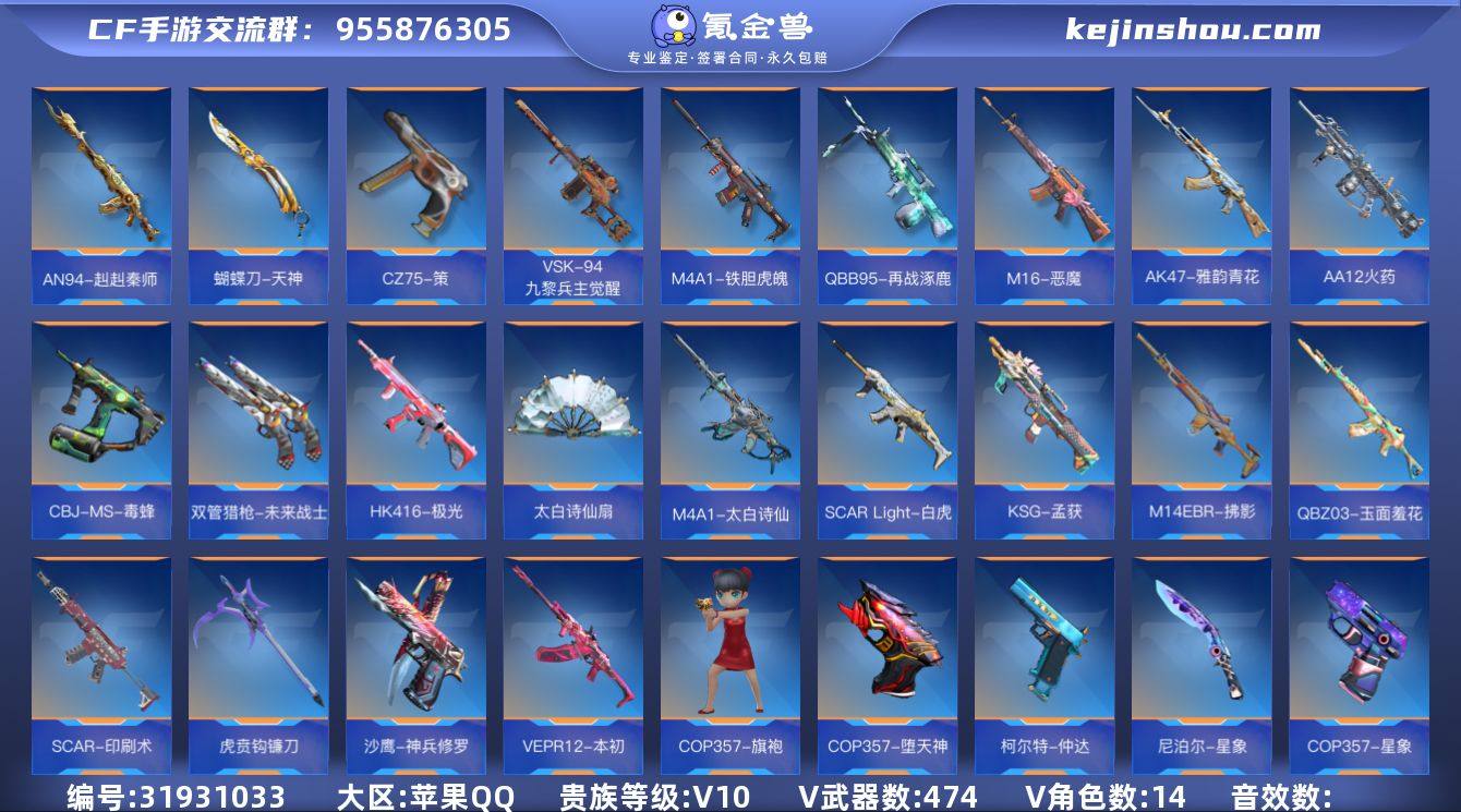 【9】枪圣-15英雄角色数-459英雄武器数 【王者系列】:王者之翼,王者之势,王者之力,王者之影,王者之武,王者之怒*2,王者之魄,王者之心*2,王者之神,王者之锋*4,王者之迹,王者之翎,王者之腾,王者之圣,王者之狱,王者之魂,王者之啸,王者幻神,王者之仞,王者之隐,王者之霆,QBZ03-王者蔷薇,王者之技,王者之誉,M4A1-雷霆王者,AK47-雷霆王者,M12S-雷霆王者,COP 357-雷霆王者*2,雷霆王者之锋 【热门武器】:M200-权,KSG-孟获*3,CZS2-仲康,COP 357-安琪拉,AK47-元让,AN94-盖,81式-光明之神,MK47-仁德,M4A1-七色宝葫,SCAR-文远,AK47-孟德,M4A1-仲达,AK47-奉先,AK47-常胜,M4A1-星象,AK47-游骑兵,M4A1-游骑兵*3,TAC-慈,M200-幻神,AWM-妙才,AWM-游骑兵,VEPR12-本初*2,81式-阿波罗,COP 357-雷霆,COP 357-旗袍,COP 357-星象,COP 357-堕天神*5 【角色】:审判者,葵,幽灵刀锋-觉醒,关小雨,云悠悠,雅典娜,蔡文昭*2,夏日灵狐-X,炽天使-X,祝融夫人,零-新生,步练师,虹儿,钟小魁 【英雄武器】:AK47-无影,AK47-火麒麟*2,AK47-黑武士,AK47-沙漠领主,AK47-牡丹精灵,AK47-游骑兵,AK47-Rush-星速,AK47-常胜,AK47-孟德,AK47-猩红传说*2,AK47-燎天净火,AK47-奉先,AK47-血武士,AK47-华夏传说,AK47-死神,AK47-黑鲨,AK47-风神翼龙,AK47-元让,AK47-雅韵青花,AK47-谜城烟火,M4A1-雷神*2,M4A1-黑骑士*2,M4A1-黑龙,M4A1-死神*2,M4A1-游骑兵*3,M4A1-星象,M4A1-Rush-夜袭,M4A1-龙血,M4A1-仲达,M4A1-竞界荣光,M4A1-七色宝葫,M4A1-机械迷城*2,M4A1-赛博雷神*2,M4A1-破空冰刃*2,M4A1-运输船,M4A1-猎神,M4A1-雷霆王者,M4A1-太白诗仙,M4A1-铁胆虎魄,QBZ95-天使,SCAR-幽暗骑士*3,SCAR-文远,SCAR Light-白虎,SCAR-探星者,SCAR-印刷术,SCAR-心动...