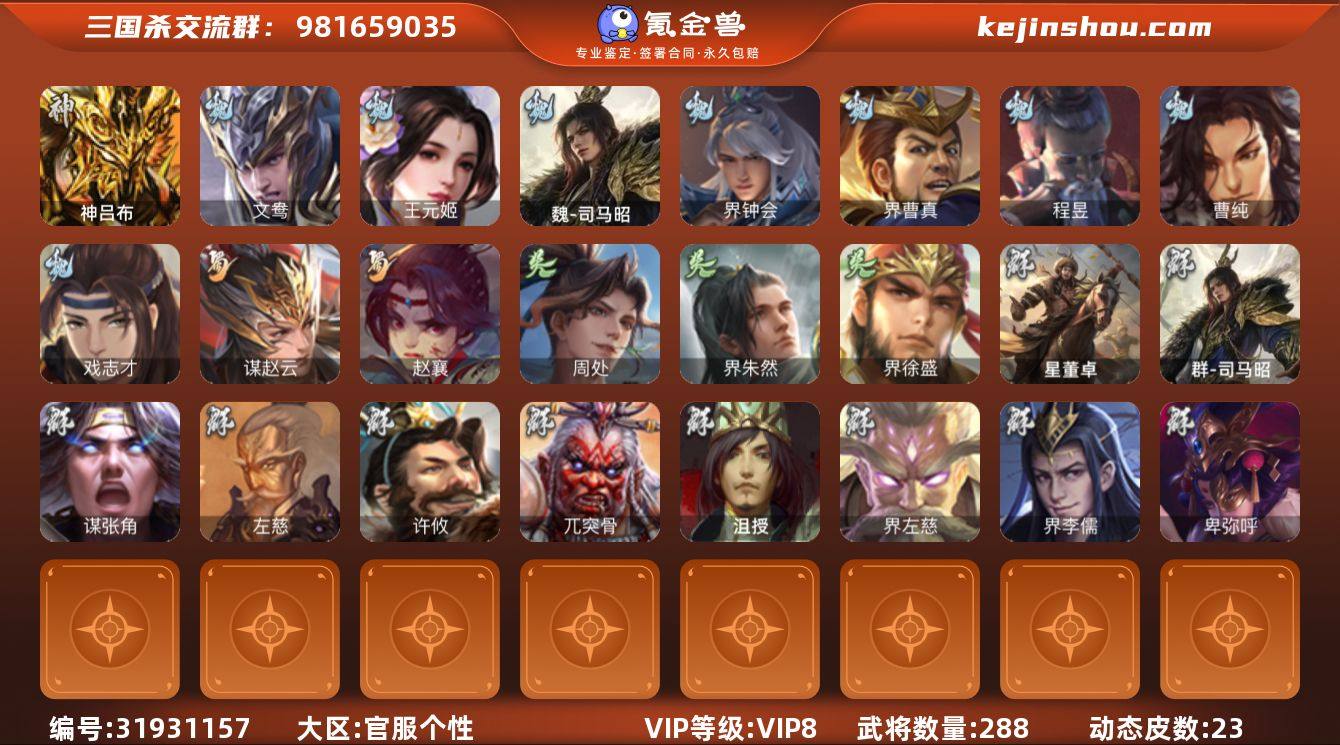 【14788668】官阶:大将军;VIP等级:VIP9;史诗武将数量:32;动态皮肤数量:35;武将总数:344;史诗宝珠数量:21;将魂数量:8601;神将:3;魏国史诗武将:35;蜀国史诗武将:7;吴国史诗武将:3;群史诗武将:12 神赵云,神孙策,神诸葛亮,星周不疑,杨修,界钟会,界于禁,郝昭,曹婴,曹纯,戏志才,程昱,谋马超,张星彩,王平,沙摩柯,谯周,花鬘,董允,留赞,界徐盛,势太史慈,左慈,星黄忠,星甘宁,麹义,沮授,界李儒,公孙康,许攸,星董卓,兀突骨,司马昭,神吕蒙,神周瑜,SP关羽,SP曹仁,乐进,曹昂,诸葛诞,朱灵,文聘,SP姜维,钟会,曹冲,郭淮,满宠,界王异,界曹操,界司马懿,界夏侯惇,界张辽,界许褚,界郭嘉,李典,曹真,韩浩史涣,陈群,曹叡,曹休,钟繇,司马朗,王基,郭皇后,辛宪英,界甄姬,吕虔,鲁芝,蒯越蒯良,界荀彧,界徐晃,界曹丕,界邓艾,张恭,界曹植,界曹彰,界满宠,界郭淮,卞夫人,蔡贞姬,袁涣,崔琰,毛玠,阮慧,谋于禁,牵招,胡班,玄毌丘俭,牛金,界夏侯渊,臧霸,唐咨,SP孙尚香,关银屏,夏侯霸,马良,关兴张苞,廖化,界马岱,关平,简雍,刘封,界法正,界关兴张苞,界刘备,界关羽,界张飞,界赵云,界马超,SP徐庶,吴懿,周仓,张松,刘谌,夏侯氏,糜竺,李严,黄皓,吴苋,秦宓,界黄月英,界诸葛亮,赵统赵广,严颜,界伊籍,界卧龙诸葛,界庞统,界孟获,界祝融,陈到,吕凯,张翼,杨仪,邓芝,傅肜,陈震,费祎,糜夫人,许靖,刘巴,谋庞统,界张嶷,谋孟获,谋张飞,李遗,霍峻,诸葛果,蒋琬费祎,糜芳傅士仁,甘夫人,孙茹,凌操,大乔小乔,诸葛恪,诸葛瑾,孙鲁育,程普,韩当,潘璋马忠,虞翻,朱然,界甘宁,界吕蒙,界黄盖,界周瑜,界大乔,界陆逊,孙鲁班,朱桓,顾雍,孙休,朱治,全琮,孙登,徐氏,薛综,界孙权,界孙尚香,潘濬,孙亮,严畯,界孙坚,吕岱,周鲂,周妃,卫温诸葛直,界吴国太,界凌统,界韩当,界虞翻,界潘璋马忠,孙邵,桥公,张温,陈武董袭,孙翊,蒋钦,吕范,界顾雍,界孙鲁班,谋吕蒙,谋周瑜,界全琮,谋小乔,张布,谋...