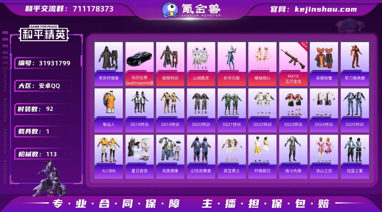 安卓 手Q-4粉装-1特效枪-1载具-0粉色飞行器-35754热力值-7王牌印记-92套装-113枪皮HZ2622702 【热门品类】:套装-奇异狩猎者,角色-军刀雅典娜,套装-AG战队服,套装-龟仙人 【粉色套装】:粉装-极限特训,粉装-山涧鹿灵,粉装-吟月归客,粉装-橘柚倾心 【粉色枪皮等级】:M416-五爪金龙(七级) 【粉色载具】:玛莎拉蒂Quattroporte(夜幕蓝) 【粉色枪皮】:M416-五爪金龙 【粉色降落伞】:至尊龙雀降落伞,甜蜜誓约降落伞,天之羽翼降落伞,青春物语降落伞,橘柚倾心降落伞,炙焰牛王降落伞,荒漠赏金降落伞,环太平洋降落伞,梦幻舞会降落伞,异瞳寒姬降落伞,炫彩糖果降落伞 【稀有套装】:套装-龟仙人,套装-雪国风尚,角色-霜刃之御 【稀有枪皮】:AKM-恐龙拽拽,AKM-环太平洋,AKM-破晓战魂,AKM-龙的传人,M16A4-幻世战舞者,M16A4-甜心亚梦,SCAR-L-玉兔迎春,M416-暗星紫秘,M416-月影鸳鸯,M416-糯团青竹,M416-紫翼圣骑,GROZA-异彩先驱,GROZA-懵萌河马,GROZA-田园牧歌,GROZA-紫翼圣骑,AUG-耀粉歌者,QBZ-彩虹符号,QBZ-飞驰魅影,M762-天降萌叽,M762-奇异狩猎者,Mk47-妙红点点,G36C-懵萌河马,G36C-炙焰牛王,G36C-青丘仙客,AC-VAL-天降萌叽,AC-VAL-彩虹甜喵,AC-VAL-甜心亚梦,蜜獾-天降萌叽,蜜獾-娇憨猪猪,UZI-啾咪啾咪,UZI-娇憨猪猪,UZI-炫彩节奏,UZI-金玉无双,UMP45-生命誓言,Vector-生命誓言,Vector-田园牧歌,Vector-音爆索尼克,汤姆逊-天降萌叽,汤姆逊-奇异狩猎者,汤姆逊-异彩先驱,汤姆逊-环太平洋,MP5K-异彩先驱,P90-闪光银龙,P90-飞驰魅影,Kar98K-炫彩节奏,Kar98K-飞驰魅影,M24-炫彩节奏,M24-奇异狩猎者,AWM-垂柳戏鸭,AWM-庄周梦蝶,SKS-炫彩节奏,VSS-彩虹符号,VSS-田园牧歌,Mini14-异彩先驱,Mini14-旋转彩虹,Mk14-童趣迷兔,SLR-娇憨猪猪,莫辛纳甘-懵...